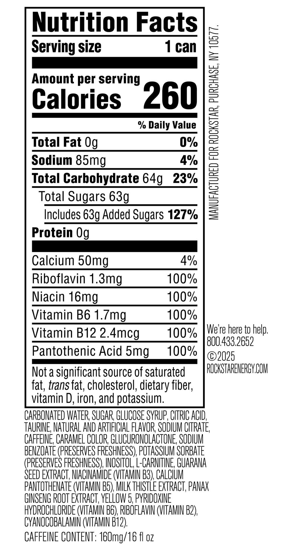 Ingredients: Carbonated Water, Sugar, Glucose Syrup, Citric Acid, Taurine, Natural And Artificial Flavor, Sodium Citrate, Caffeine, Caramel Color, Glucuronolactone, Sodium Benzoate (Preserves Freshness), Potassium Sorbate (Preserves Freshness), Inositol, L-Carnitine, Guarana Seed Extract, Niacinamide (Vitamin B3), Calcium Pantothenate (Vitamin B5), MILK Thistle Extract, Panax Ginseng Root Extract, Yellow 5, Pyridoxine Hydrochloride (Vitamin B6), Riboflavin (Vitamin B2), Cyanocobalamin (Vitamin B12) Contains: milk Contains 160mg of caffeine