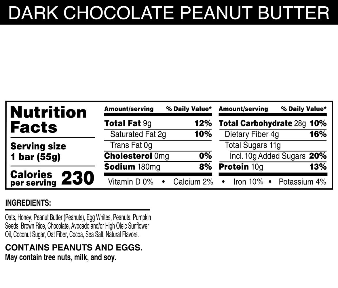 Ingredients: Oats, Honey, Peanut Butter (Peanuts), Egg Whites, Peanuts, Pumpkin Seeds, Brown Rice, Chocolate, Avocado And, Or High Oleic Sunflower Oil, Coconut Sugar, Oat Fiber, Cocoa, Sea Salt, Natural Flavors. Contains: Contains peanuts and eggs. may contain tree nuts, milk, and soy.
