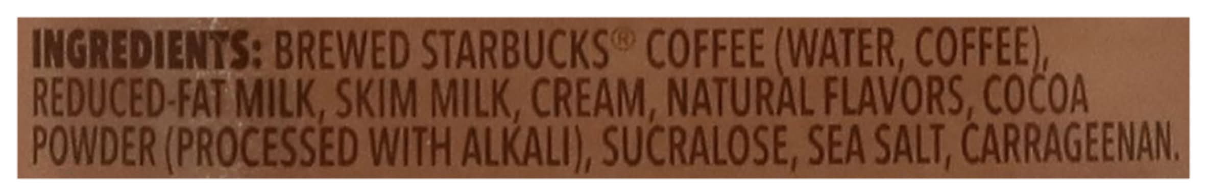 Ingredients: Brewed Starbucks Coffee (Water, Coffee), Reduced-Fat Milk, Skim Milk, Cream, Natural Flavors, Cocoa Powder (Processed with Alkali), Sucralose, Sea Salt, Carrageenan Contains: Milk
