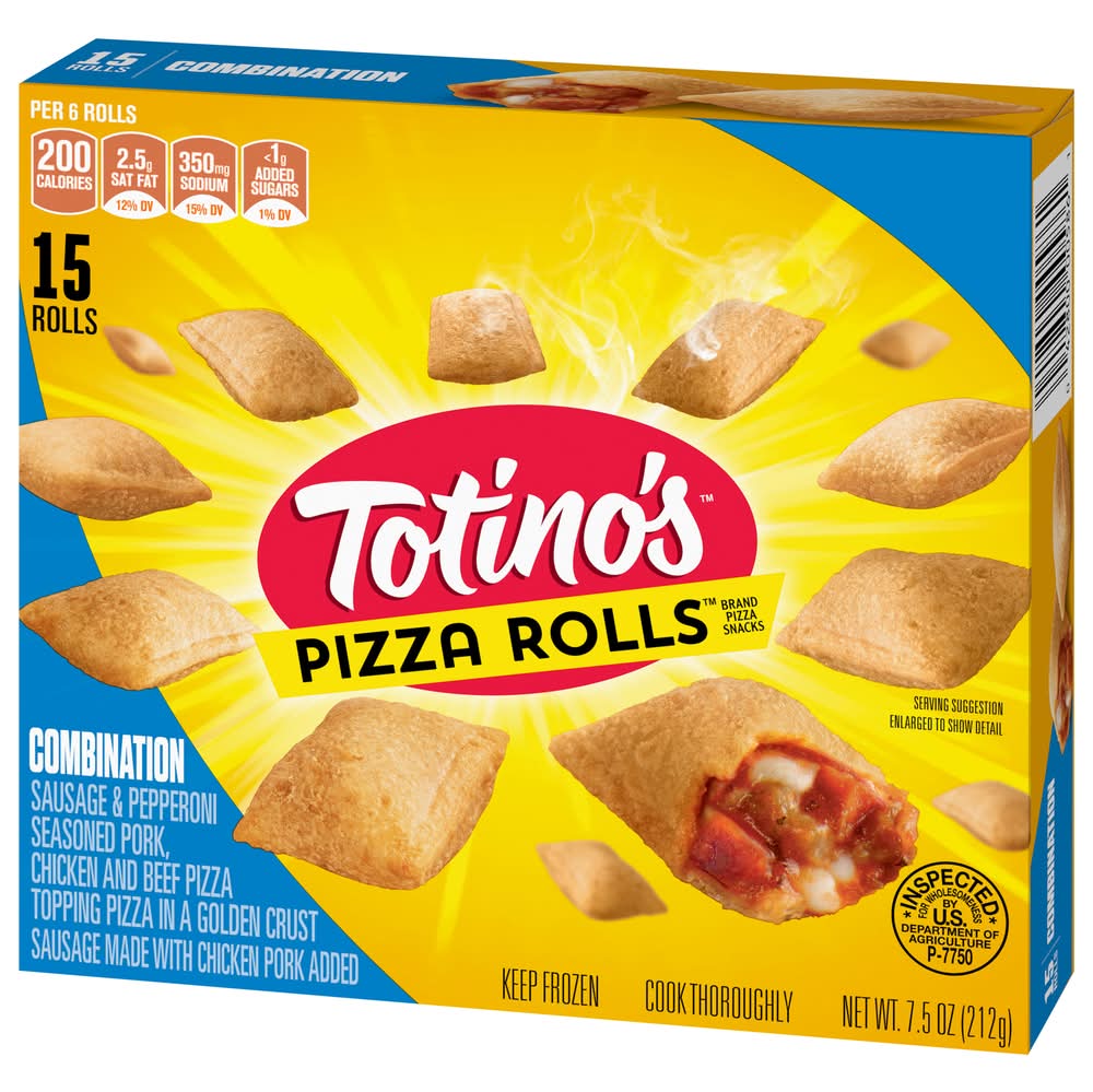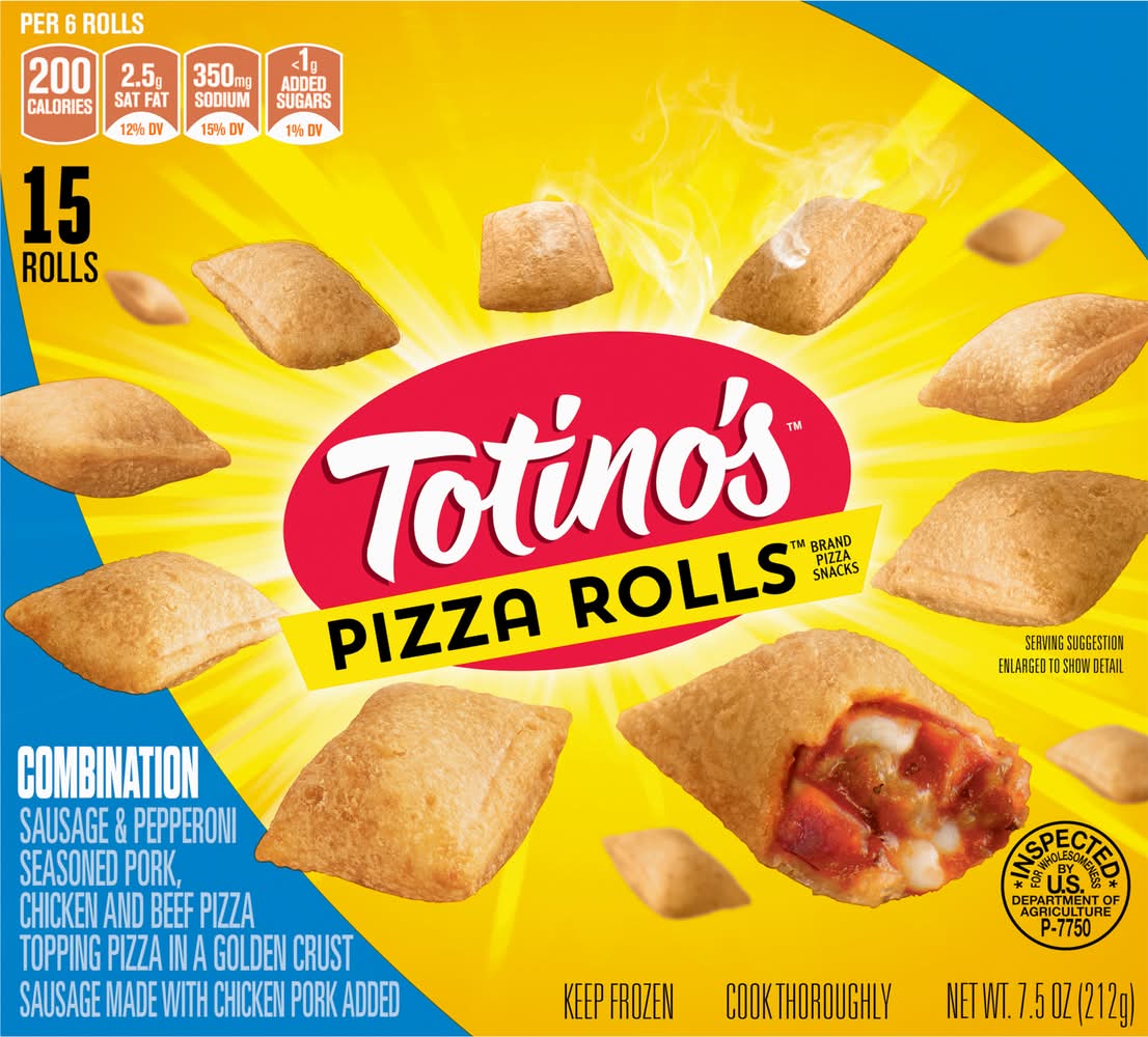 Totino's Combination Flavored Pizza Rolls turn epic pizza toppings into a tasty poppable bite you can enjoy any time. Every serving excites your taste buds with a sausage and pepperoni flavored filling inside bite-sized pockets of goodness, baked to a golden finish. From chill nights on the couch or gaming with friends to hosting a gameday crowd, Pizza Rolls are the perfect savory snack. Frozen Pizza Rolls are ready whenever you are. Heat them up in no time with no fuss. Pop 'em in the microwave, oven, or air fryer, following the easy directions on the package. Ideal for teens, keep a stash in your freezer for when they crave a bite before rushing out. Switch things up by serving alongside your favorite dips or sauces. Make these flavorful pizza flavored snack bites an alternative to frozen pizza. Fun to eat, add them to any party spread as an ideal finger food. With 15 Pizza Rolls and about 2.5 servings in this package, there's plenty to share. • Brand: Totino's • Flavor: Combination • Packaging: Reusable