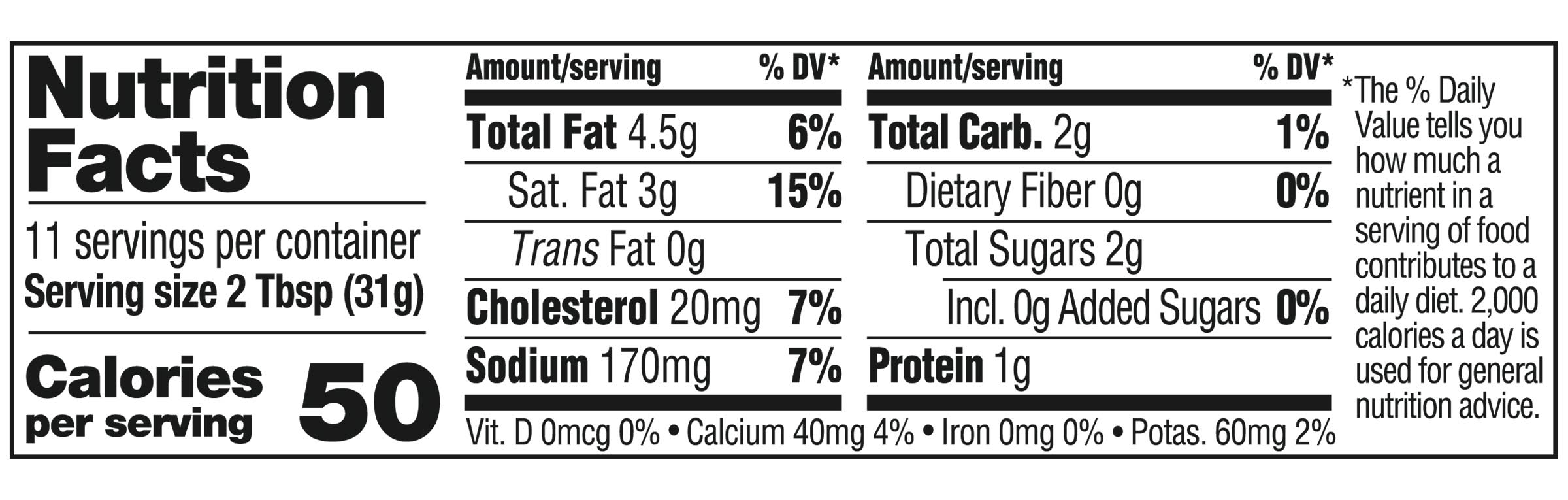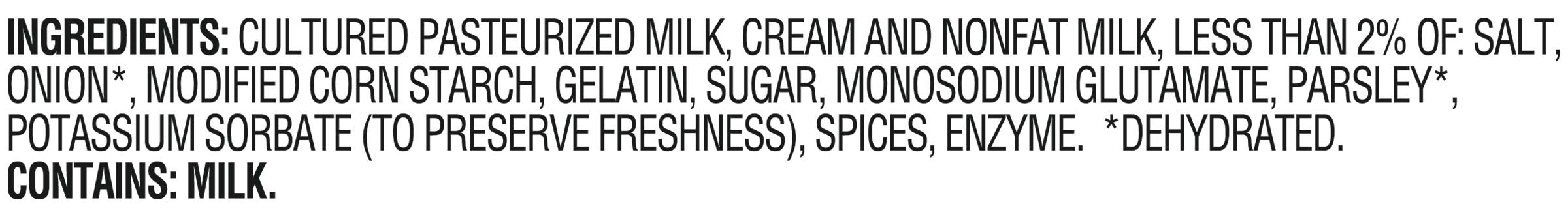Ingredients: CULTURED PASTEURIZED MILK, CREAM AND NONFAT MILK, LESS THAN 2% OF: SALT, ONION*, MODIFIED CORN STARCH, GELATIN, SUGAR, MONOSODIUM GLUTAMATE, PARSLEY*, POTASSIUM SORBATE (TO PRESERVE FRESHNESS), SPICES, ENZYME. *DEHYDRATED. Contains: Contains: milk.
