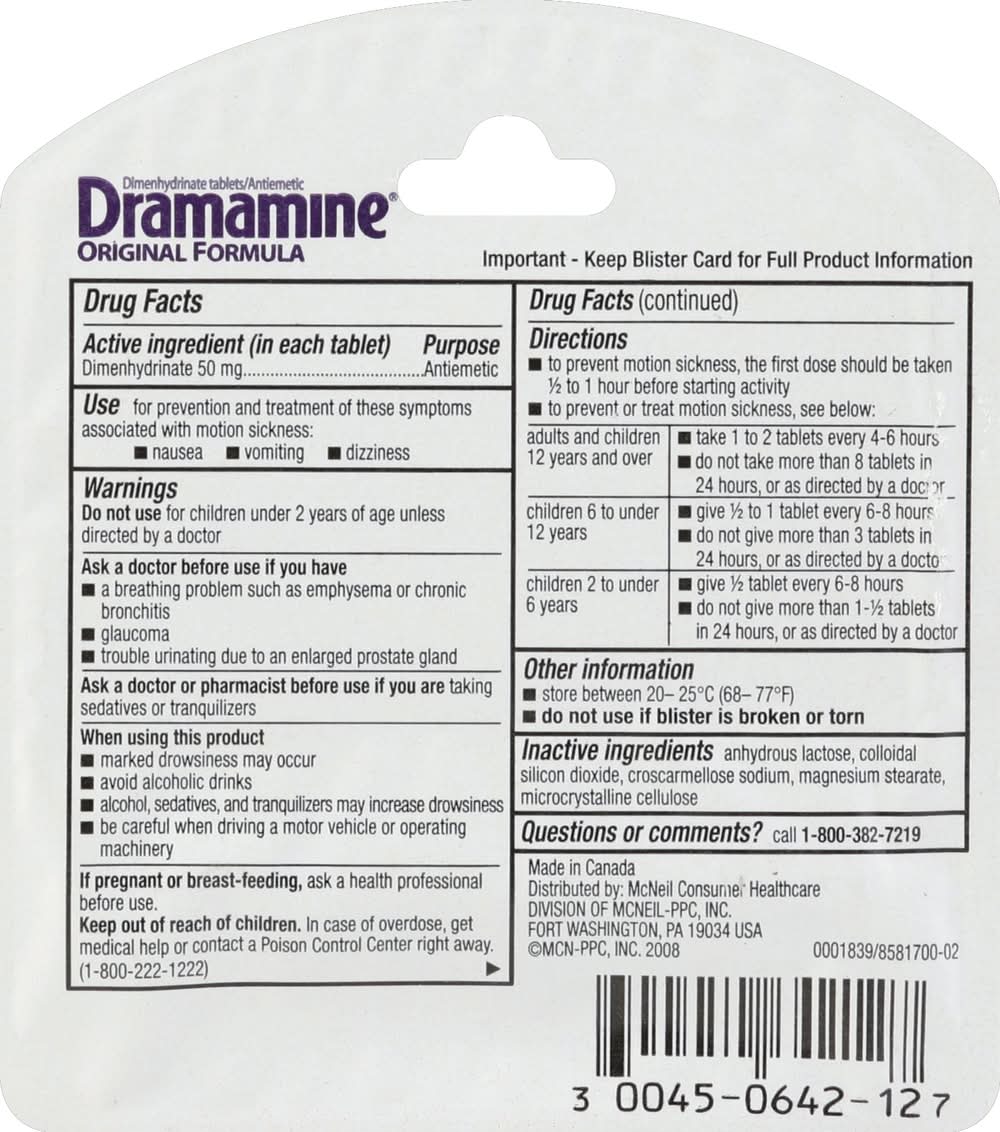 Directions: important: keep blister card for full product information. to prevent motion sickness, the first dose should be taken 1/2 to 1 hour before starting activity. to prevent or treat motion sickness, see below: adults and children 12 years and over: take 1 to 2 tablets every 4-6 hours; do not take more than 8 tablets in 24 hours, or as directed by a doctor. children 6 to under 12 years: give 1/2 to 1 tablet every 6-8 hours; do not give more than 3 tablets in 24 hours, or as directed by a doctor. children 2 to under 6 years: give 1/2 tablet every 6-8 hours. do not give more than 1-1/2 tablets in 24 hours, or as directed by a doctor. store between 68-77 degrees f (20-25 degrees c).