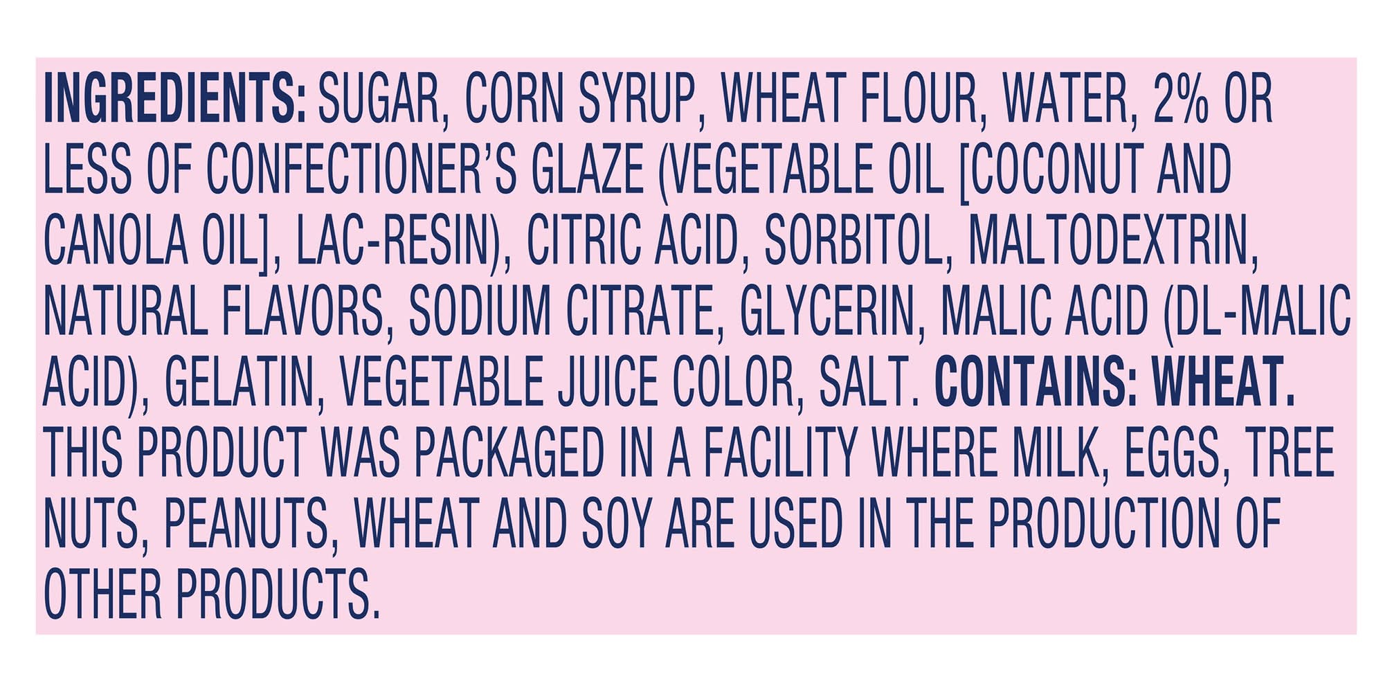 Ingredients: SUGAR, CORN SYRUP, WHEAT FLOUR, WATER, AND LESS THAN 2% OF CITRIC ACID, SORBITOL, MALTODEXTRIN, SODIUM CITRATE, GLYCERIN, MALIC ACID (DL-MALIC ACID), GELATIN, VEGETABLE AND FRUIT JUICE COLOR, SALT, NATURAL FLAVORS, CONFECTIONERS GLAZE (LAC-RESIN)