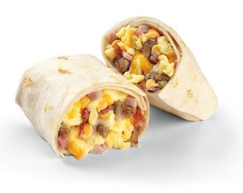 Eggs with Sausage, Ham, Bacon, Cheddar Cheese, and Nacho Cheese Sauce in a White Flour Tortilla Brand: 7-eleven