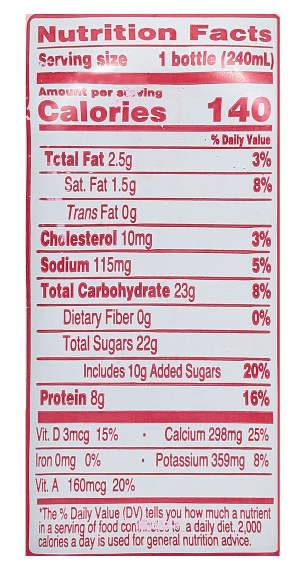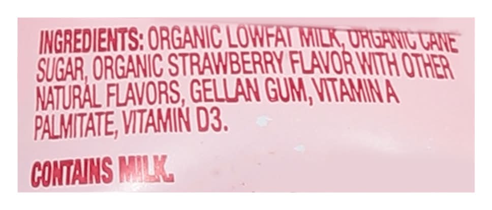 Ingredients: Organic Lowfat Milk, Organic Cane Sugar, Organic Strawberry Flavor with Other Natural Flavors, Gellan Gum, Vitamin A Palmitate, Vitamin D3 Contains: Milk