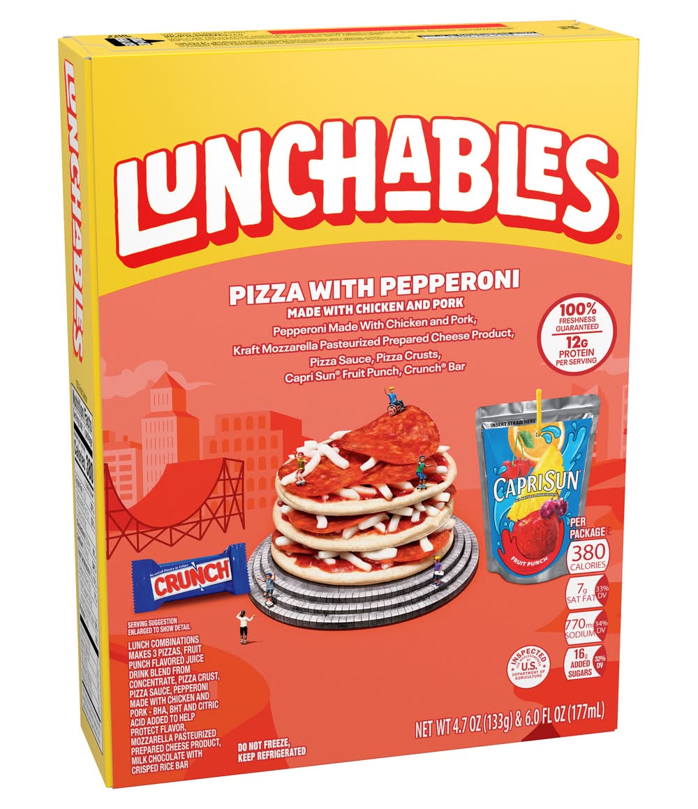 Powering kids forward, our Lunchables Pizza with Pepperoni Kit is the perfect option for a convenient snack kids will enjoy any time of day! Our pizza kit features real, epic food including pizza crust, Kraft mozzarella pasteurized prepared cheese product, pizza sauce, pepperoni made with pork and chicken, a Capri Sun fruit punch drink and a delectable Nestle Crunch bar for a dessert treat. Great for on the go, each ingredient comes in its own individual compartment in our serving tray, making it easy and fun to build your own unique combinations. Every 10.7 ounce box contains 13 grams of protein per serving. Keep our convenient single-serve, on-the-go package refrigerated until it's time for school, lunchtime or everyday snacking. • Brand: Lunchables • Packaging: Reusable