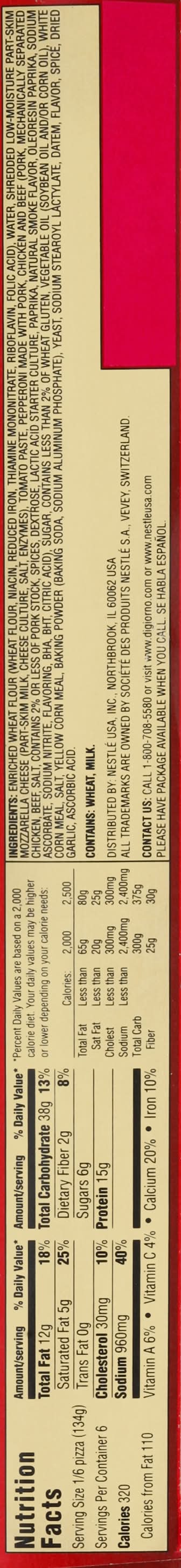 Ingredients: Enriched Wheat Flour (Wheat Flour, Niacin, Reduced Iron, Thiamine Mononitrate, Riboflavin, Folic Acid), Water, Shredded Low Moisture Part-Skim Mozzarella Cheese (Part Skim Milk, Cheese Culture, Salt, Enzymes), Tomato Paste, Pepperoni Made with Pork, Chicken and Beef (Pork, Mechanically Separated Chicken, Beef, Salt, Contains 2% or Less of Pork Stock, Spices, Dextrose, Lactic Acid Starter Culture, Paprika, Natural Smoke Flavor, Oleoresin Paprika, Sodium Ascorbate, Sodium Nitrite, Flavoring, BHA, BHT, Citric Acid), Sugar, Contains Less than 2% of Wheat Gluten, Vegetable Oil (Soybean Oil and/or Corn Oil), White Corn Meal, Salt, Yellow Corn Meal, Baking Powder (Baking Soda, Sodium Aluminum Phosphate), Yeast, Sodium Stearoyl Lactylate, DATEM, Flour, Spice, Dried Garlic, Ascorbic Acid Contains: Milk, Wheat