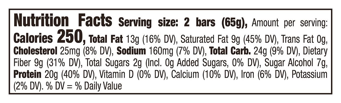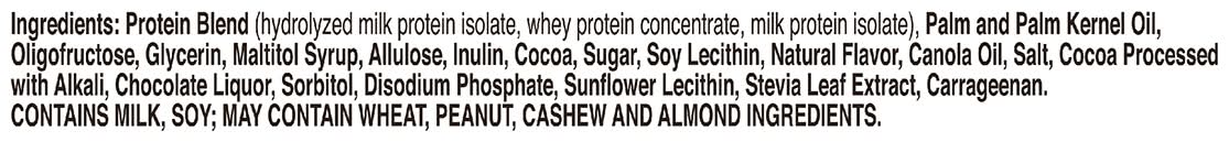 Ingredients: Protein Blend (Hydrolyzed Milk Protein Isolate, Whey Protein Concentrate, Milk Protein Isolate), Palm and Palm Kernel Oil, Oligofructose, Glycerin, Maltitol Syrup, Allulose, Inulin, Cocoa, Sugar, Soy Lecithin, Natural Flavor, Canola Oil, Salt, Cocoa Processed with Alkali, Chocolate Liquor, Sorbitol, Disodium Phosphate, Sunflower Lecithin, Stevia Leaf Extract, Carrageenan Contains: Milk, Soybeans, Wheat, Peanuts, Tree Nuts, Cashews, Tree Nuts, Almonds