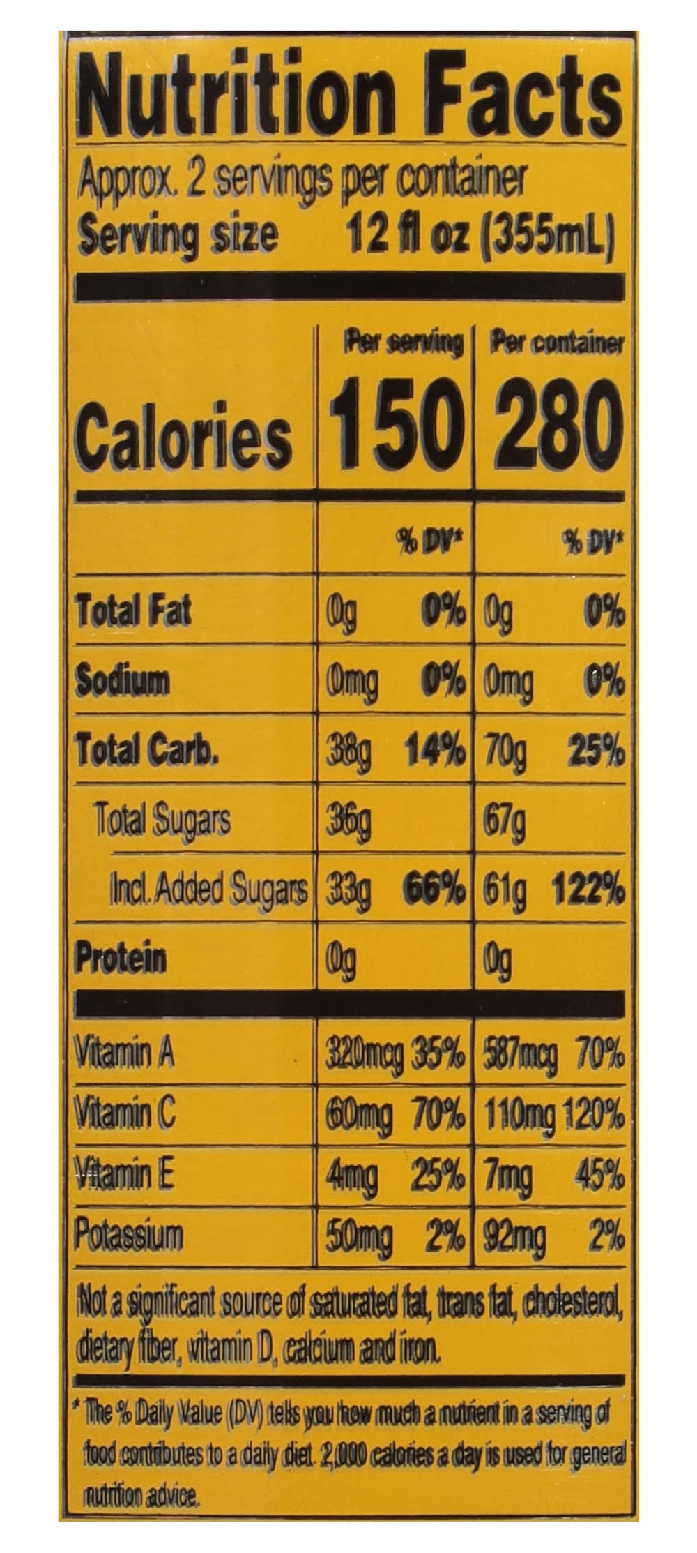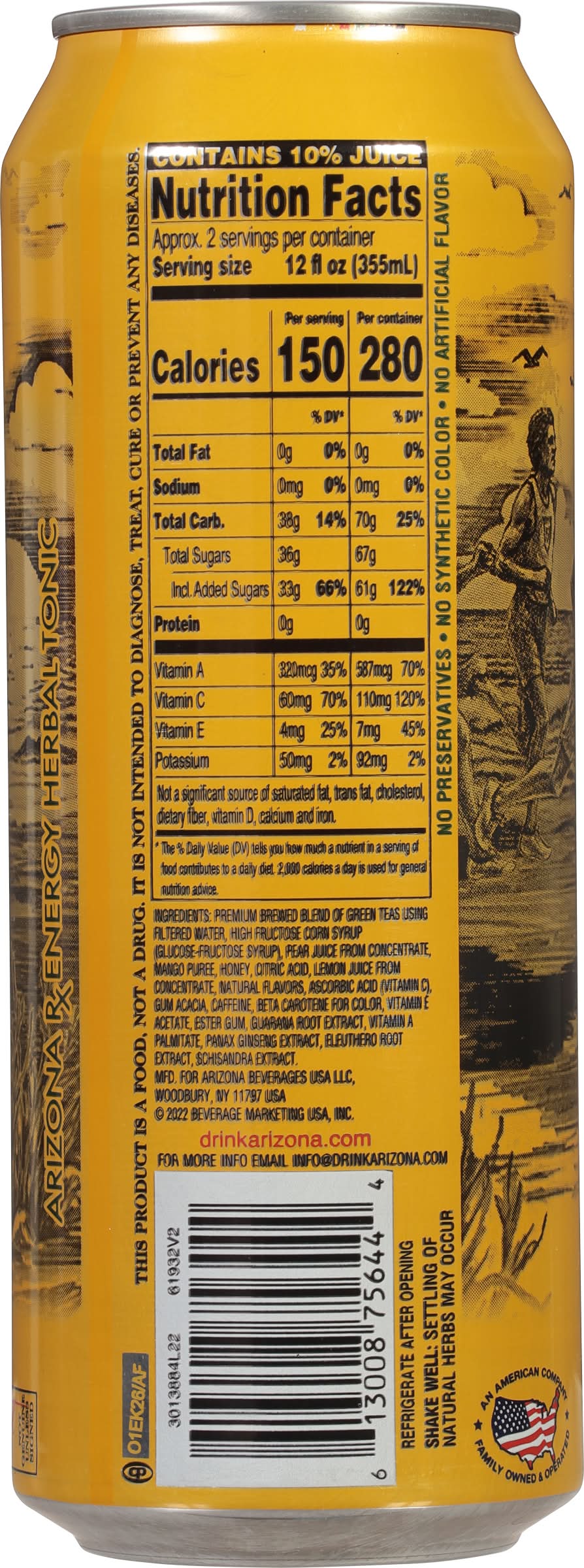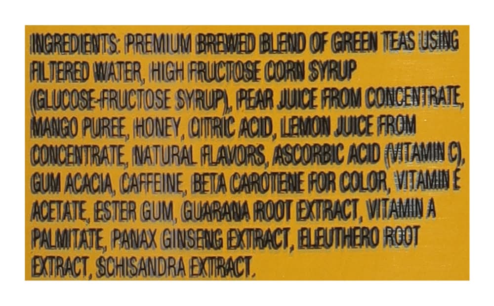 Ingredients: Premium Brewed Blend of Green Teas Using Filtered Water, High Fructose Corn Syrup (Glucose-Fructose Syrup), Pear Juice from Concentrate, Mango Puree, Honey, Citric Acid, Lemon Juice from Concentrate, Natural Flavors, Ascorbic Acid (Vitamin C), Gum Acacia, Caffeine, Beta Carotene for Color, Vitamin E Acetate, Ester Gum, Guarana Root Extract, Vitamin A Palmitate, Panax Ginseng Extract, Eleuthero Root Extract, Schisandra Extract