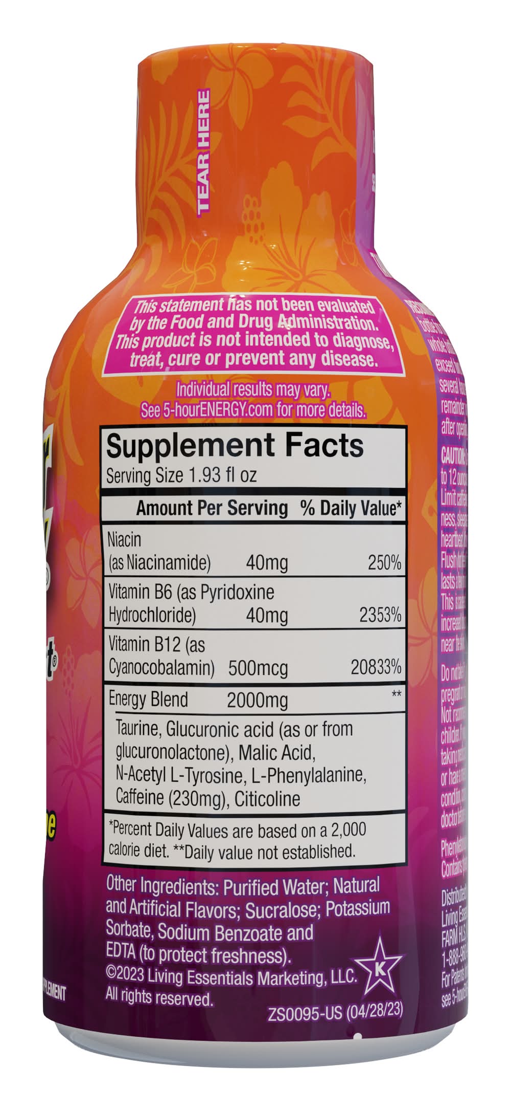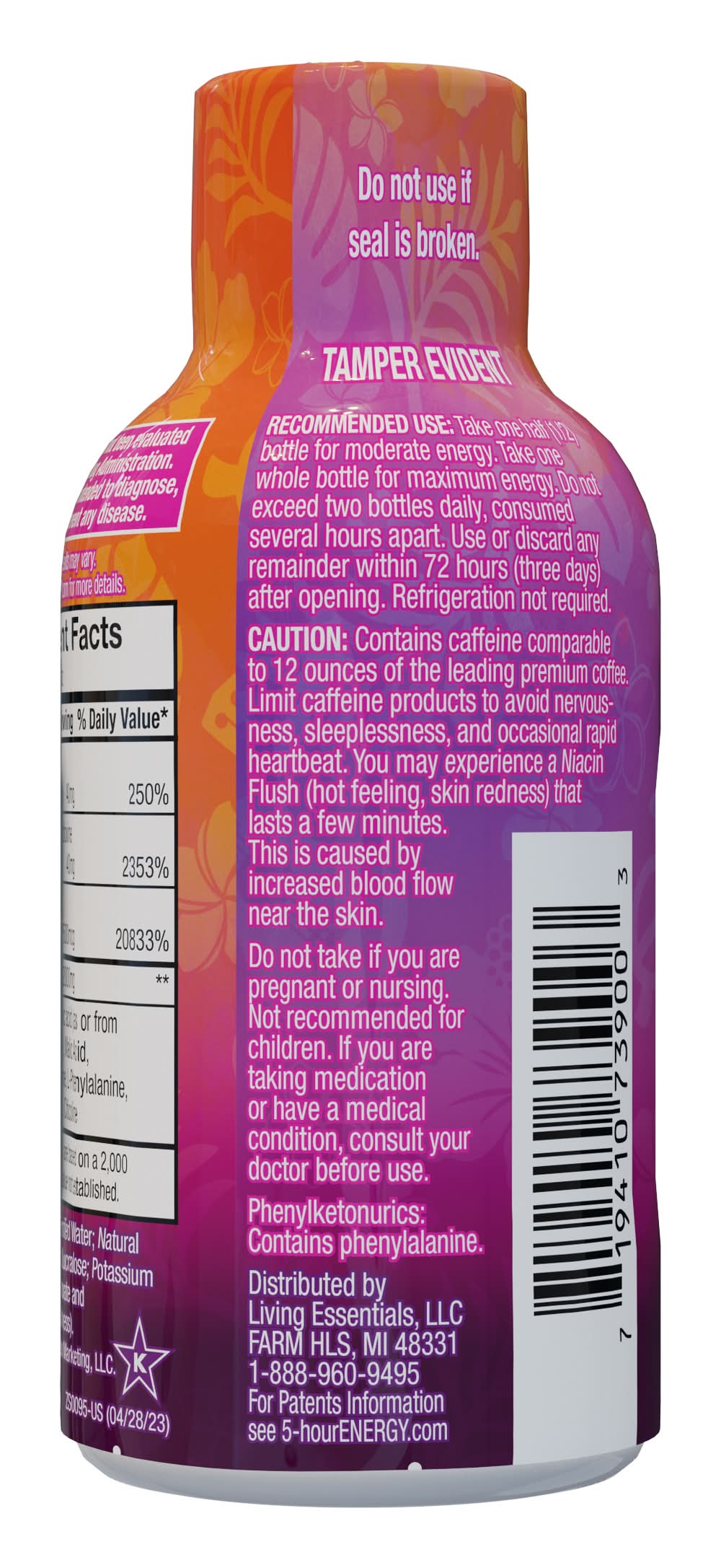 It's consumed after early morning hikes and during late-night luaus. Made with passionfruit, orange, and guava flavors, it's sweet yet smooth. Tangy, yet tart. • Brand: 5-hour energy • kosher,