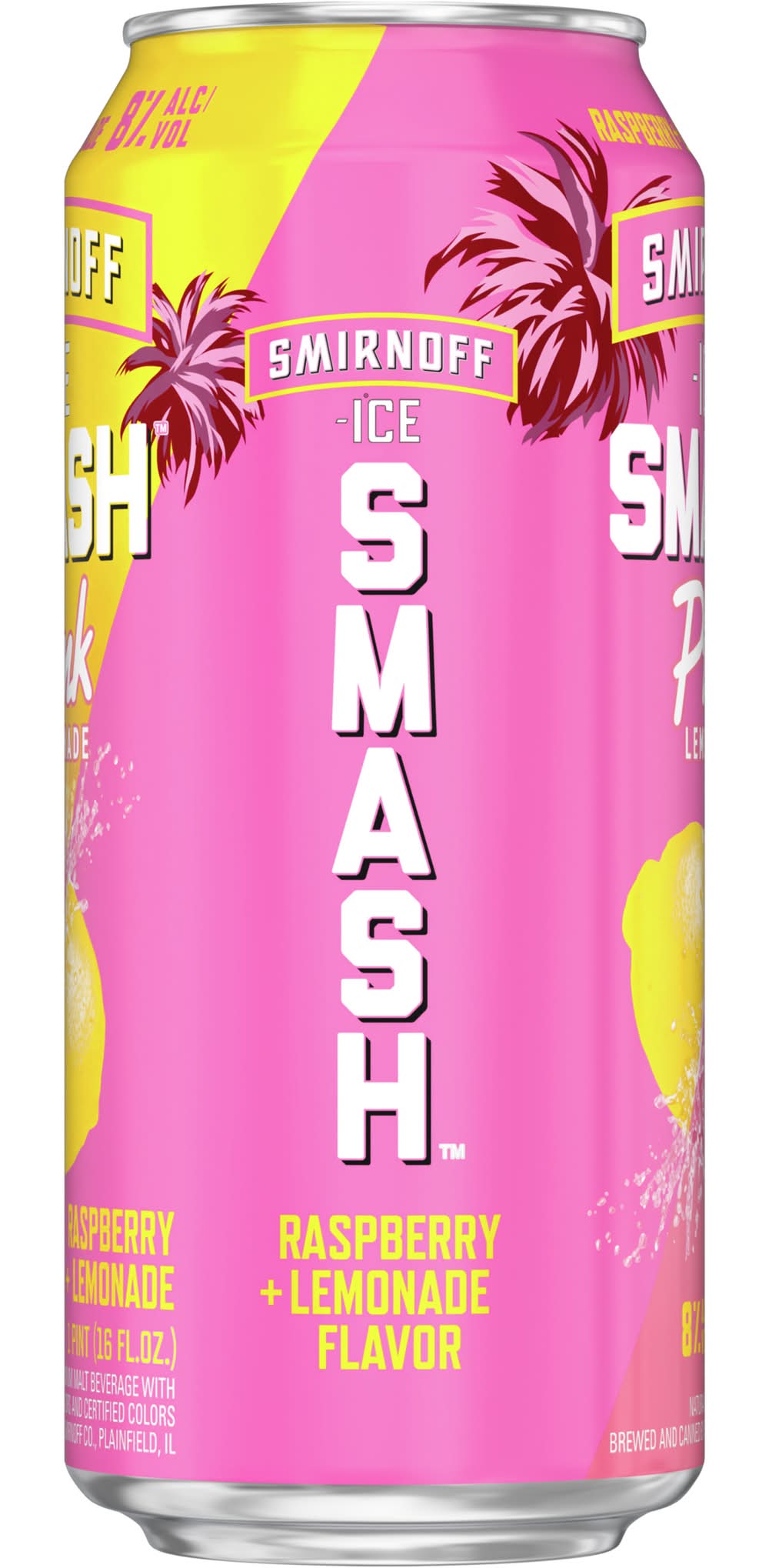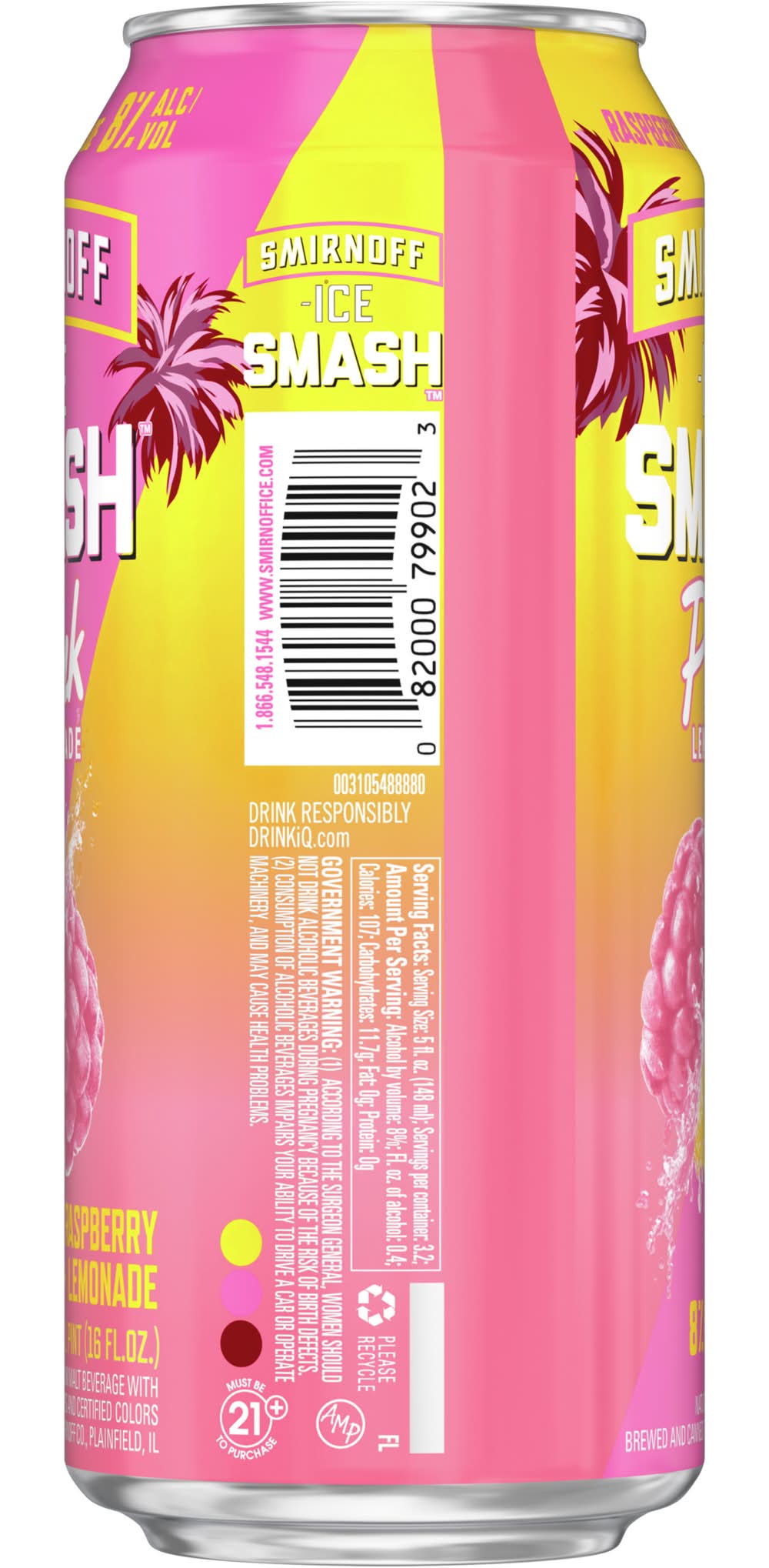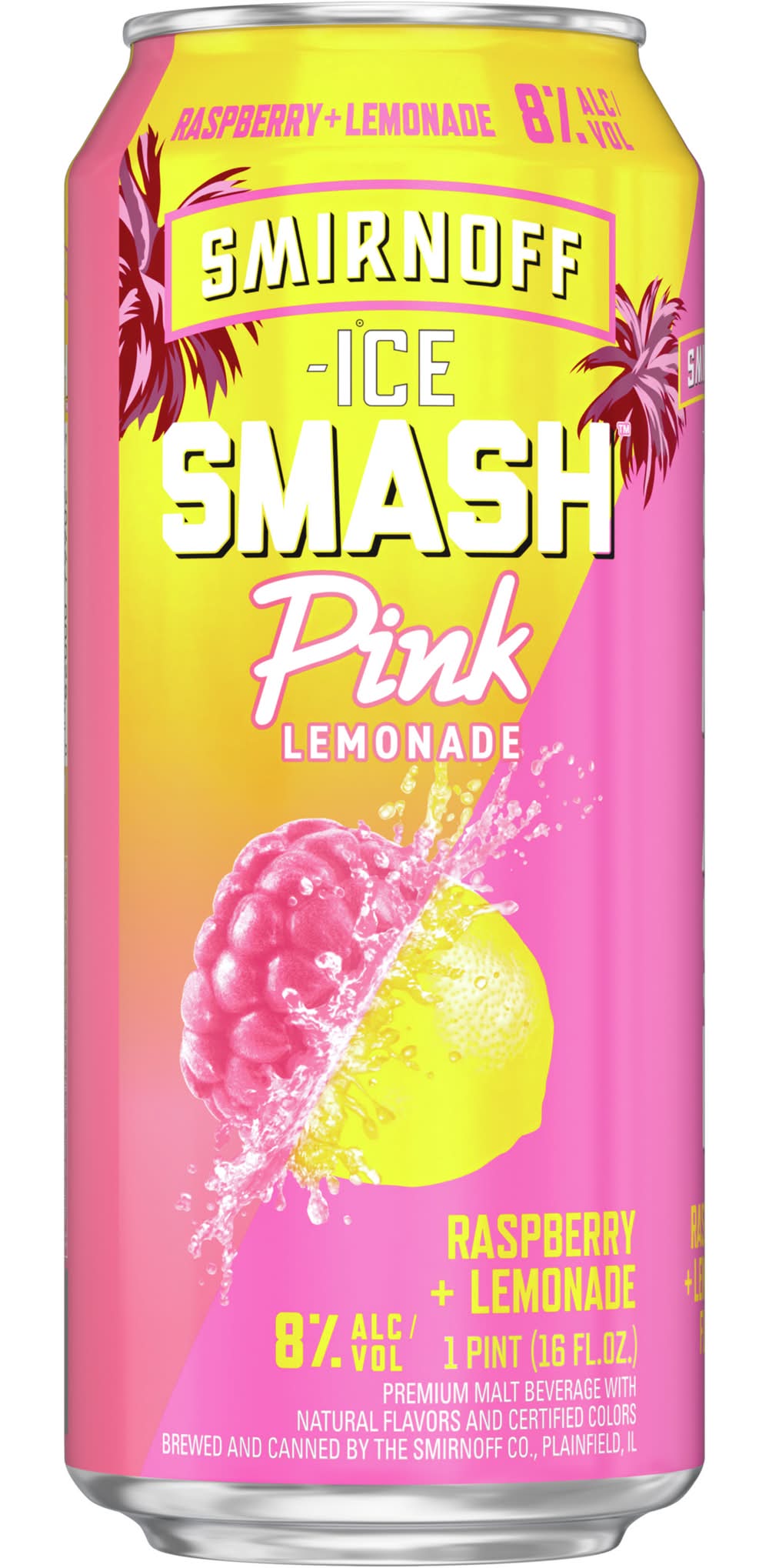 Smirnoff Ice Smash Pink Lemonade features a zesty combination of sweet raspberry flavor and lemon tartness packaged up in vibrant hot Miami vibes. Lightly carbonated with a refreshing flavor, Smirnoff Ice Smash Pink Lemonade is great for parties, barbecues and picnics or a casual evening with friends. Smirnoff Ice Smash has 8% ABV and natural flavors. One of the most popular malt beverages in the nation, Smirnoff Ice has been a staple of get-togethers and parties since 1999. Please drink responsibly. • Brand: Smirnoff • Alcohol by volume: 4.5% • Tasting notes: berry, fruity, sweet, tart • Food pairing: dessert - fruit • Packaging: Reusable