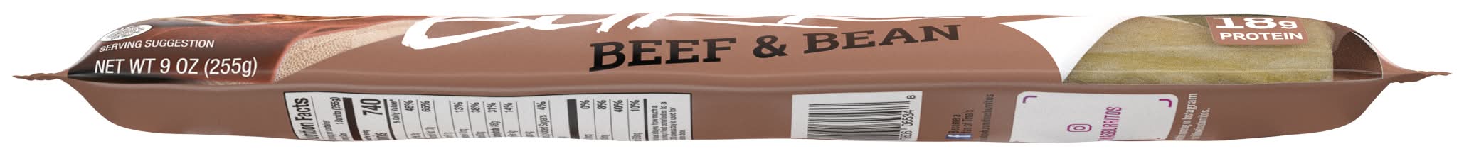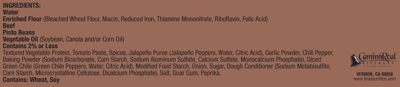 Ingredients: Water, Enriched Flour (Bleached Wheat Flour, Niacin, Reduced Iron, Thiamine Mononitrate, Riboflavin, Folic Acid), Beef, Pinto Beans, Vegetable Oil (Soybean, Canola And/Or Corn Oil), Contains 2% Or Less, Textured Vegetable Protein, Tomato Paste, Spices, Jalapeno Puree (Jalapeno Peppers, Water, Citric Acid), Garlic Powder, Chili Pepper, Baking Powder (Sodium Bicarbonate, Corn Starch, Sodium Aluminum Sulfate, Calcium Sulfate, Monocalcium Phosphate), Diced Green Chile (Green Chile Peppers, Water, Citric Acid), Modified Food Starch, Onion, Sugar, Dough Conditioner (Sodium Metabisulfite, Corn Starch, Microcrystalline Cellulose, Dicalcium Phosphate), Salt, Guar Gum, Paprika, Wheat, Soy Contains: Soy, Wheat