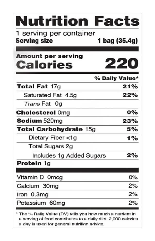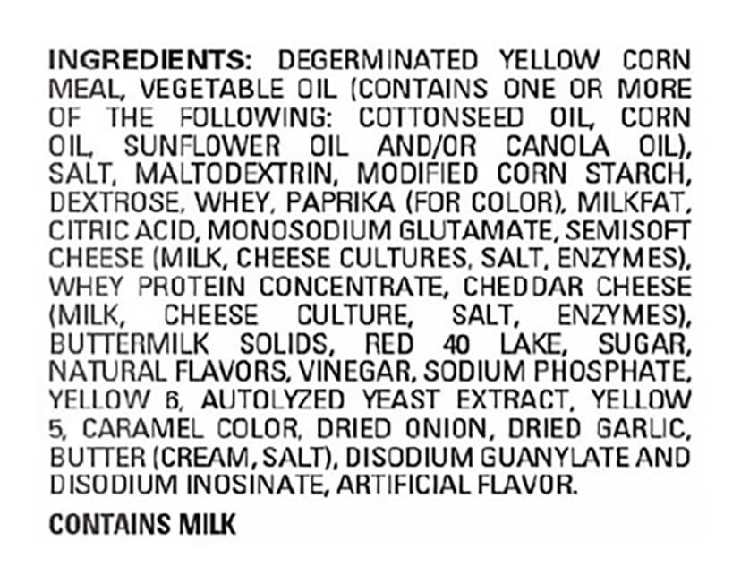 Ingredients: Degerminated Yellow Corn Meal, Vegetable Oil (Contains One or More of the Following: Cottonseed Oil, Corn Oil, Sunflower Oil and/or Canola Oil), Salt, Maltodextrin, Modified Corn Starch, Dextrose, Whey, Paprika (for Color), Milkfat, Citric Acid, Monosodium Glutamate, Semisoft Cheese (Milk, Cheese Cultures, Salt, Enzymes), Whey Protein Concentrate, Cheddar Cheese (Milk, Cheese Culture, Salt, Enzymes), Buttermilk Solids, Red 40 Lake, Sugar, Natural Flavors, Vinegar, Sodium Phosphate, Yellow 6, Autolyzed Yeast Extract, Yellow 5, Caramel Color, Dried Onion, Dried Garlic, Butter (Cream, Salt), Disodium Guanylate and Disodium Inosinate, Artificial Flavor Contains: Milk, Corn