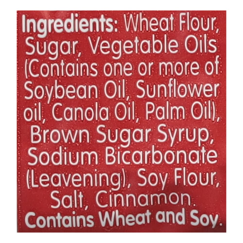 Ingredients: Wheat Flour, Sugar, Vegetable Oils (Contains One or More of Soybean Oil, Sunflower Oil, Canola Oil, Palm Oil), Brown Sugar Syrup, Sodium Bicarbonate (Leavening), Soy Flour, Salt, Cinnamon Contains: Wheat, Soybeans