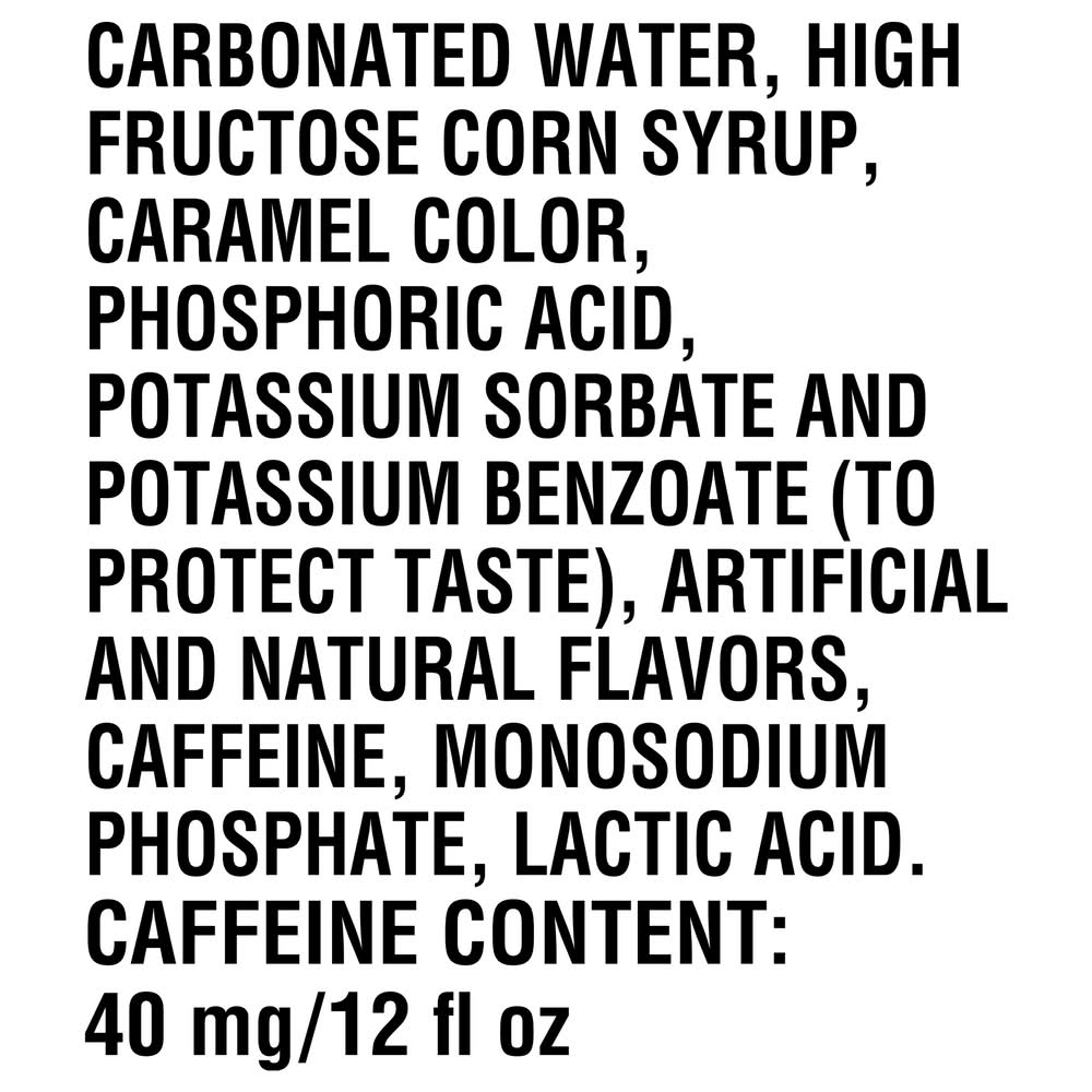 Ingredients: Carbonated Water, High Fructose Corn Syrup, Caramel Color, Phosphoric Acid, Potassium Sorbate And Potassium Benzoate (To Protect Taste), Artificial And Natural Flavors, Caffeine, Monosodium Phosphate, Lactic Acid, Polyethylene Glycol. Contains: Corn