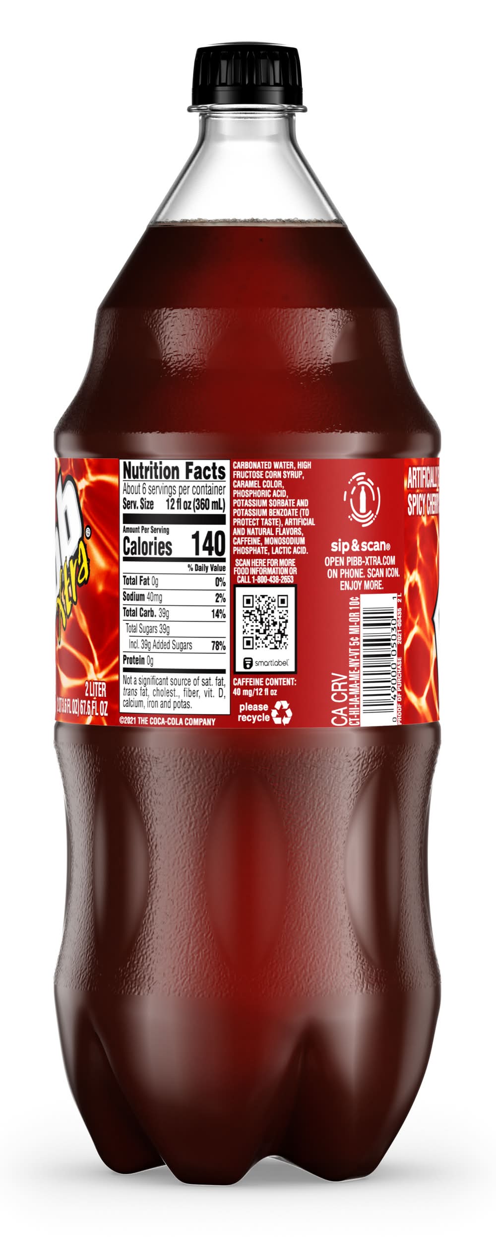 Artificially Flavored Spicy Cherry Soda Whether you call it a soda, pop, sparkling beverage, or a soft drink, Pibb Xtra provides an intensely flavored, refreshing, spicy cherry alternative to regular cola. The uniquely delicious yet familiar taste of Pibb Xtra is the perfect refreshment for drinking with meals, on the go, or any time! Also available in a zero sugar version, Pibb Zero has all of the taste of Pibb Xtra, with none of the calories. Reach for one today. • Extra bold, extra good • Spicy cherry flavored soda • 40 mg of caffeine per 12 fl oz • Perfect size sparkling beverage for drinking with meals, on the go, or any time • 2 liter bottle of Pibb Xtra • Brand: Pibb xtra • Flavor: Spicy cherry • kosher • The Coca-Cola Company, Atlanta GA 30327 • Packaging: Reusable