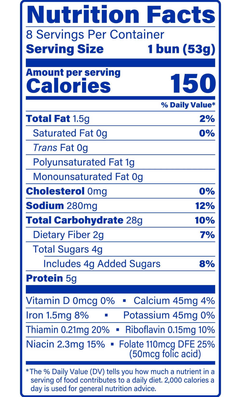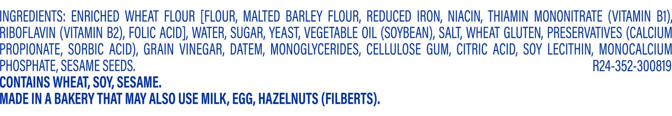 Ingredients: ENRICHED WHEAT FLOUR [FLOUR, MALTED BARLEY FLOUR, REDUCED IRON, NIACIN, THIAMIN MONONITRATE (VITAMIN B1), RIBOFLAVIN (VITAMIN B2), FOLIC ACID], WATER, SUGAR, YEAST, VEGETABLE OIL (SOYBEAN), SALT, WHEAT GLUTEN, PRESERVATIVES [CALCIUM PROPIONATE, SORBIC ACID], GRAIN VINEGAR, DATEM, MONOGLYCERIDES, CELLULOSE GUM, CITRIC ACID, SOY LECITHIN, MONOCALCIUM PHOSPHATE, SESAME SEEDS. Contains: Wheat, Barley, Soybeans, Gluten, Sesame, Milk, Eggs, Tree Nuts, Hazelnuts/Filberts