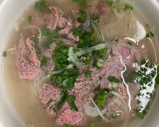 Marinated rare steak. Rice noodle soup. All noodle soups are served with a fresh dish of bean sprouts, basil, lime and sliced green pepper.