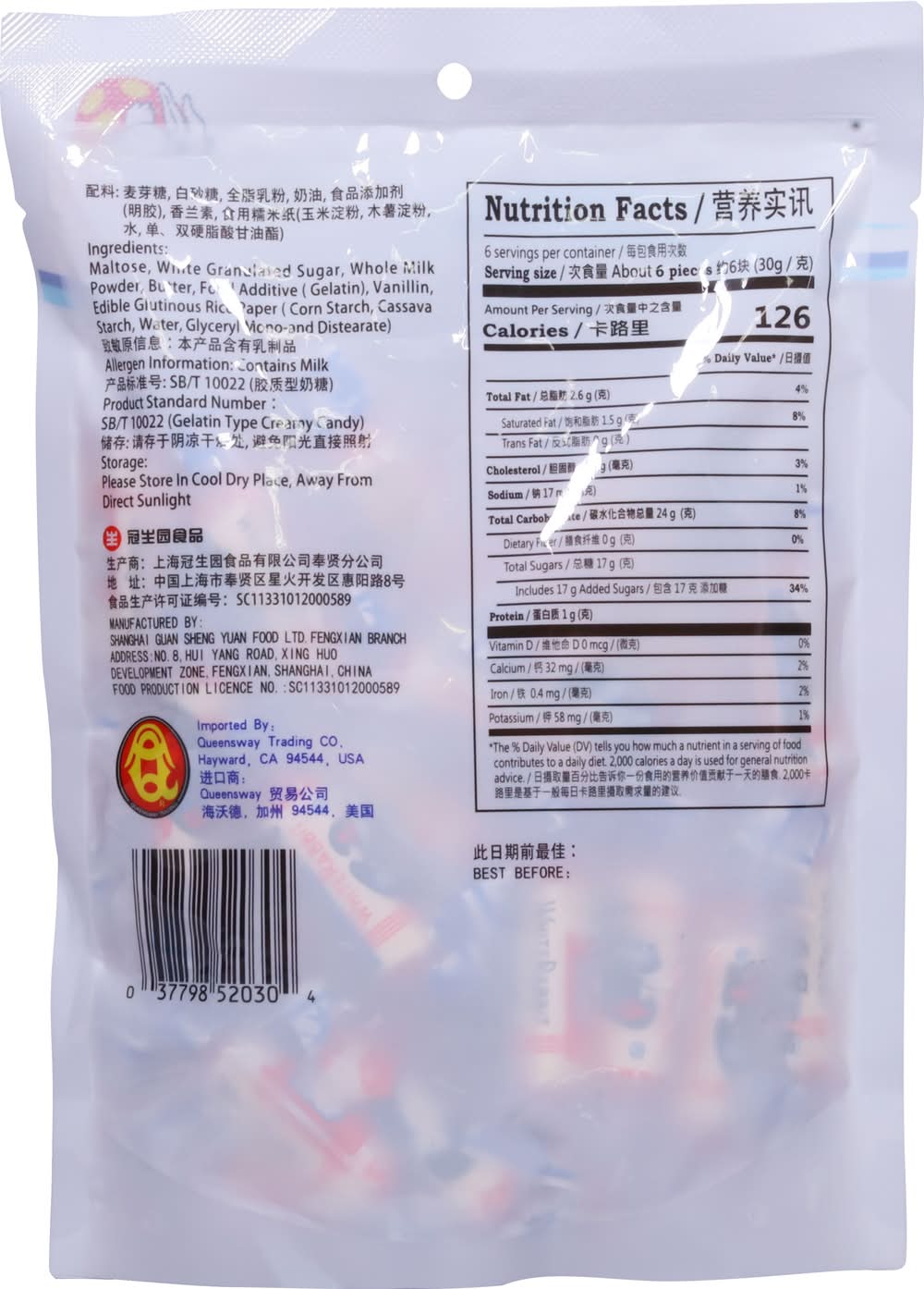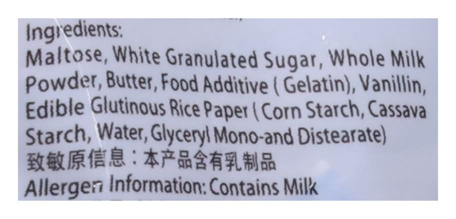 Ingredients: Maltose, White Granulated Sugar, Whole Milk Powder, Butter, Food Additive (Gelatin), Vanillin, Edible Glutinous Rice Paper (Corn Starch, Cassava Starch, Water, Glyceryl Mono-and Distearate) Contains: Milk, Corn
