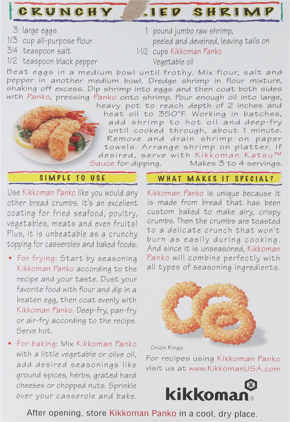 Directions for use: Directions: Simple to Use: Use Kikkoman Panko Bread Crumbs like you would any regular crumb. They're an excellent coating for fried seafood, poultry, vegetables and meats - even fruits! And as a crunchy topping for casseroles and baked foods, they're unbeatable. For Frying: Start by seasoning Kikkoman Panko Bread Crumbs according to the recipe and your taste. Dust your favorite food with flour and dip into a beaten egg, then coat evenly with Kikkoman Panko Bread Crumbs. Deep-fry or pan-fry according to the recipe. Serve hot. For Baking: Mix Kikkoman Panko Bread Crumbs with a little vegetable or olive oil, add desired seasonings like ground spices, herbs, grated hard cheeses or chopped nuts. Sprinkle over your casserole and bake. After opening, store Kikkoman Whole Wheat Panko in a cool, dry place. Storage recommendation: After opening, store Kikkoman Whole Wheat Panko in a cool, dry place.