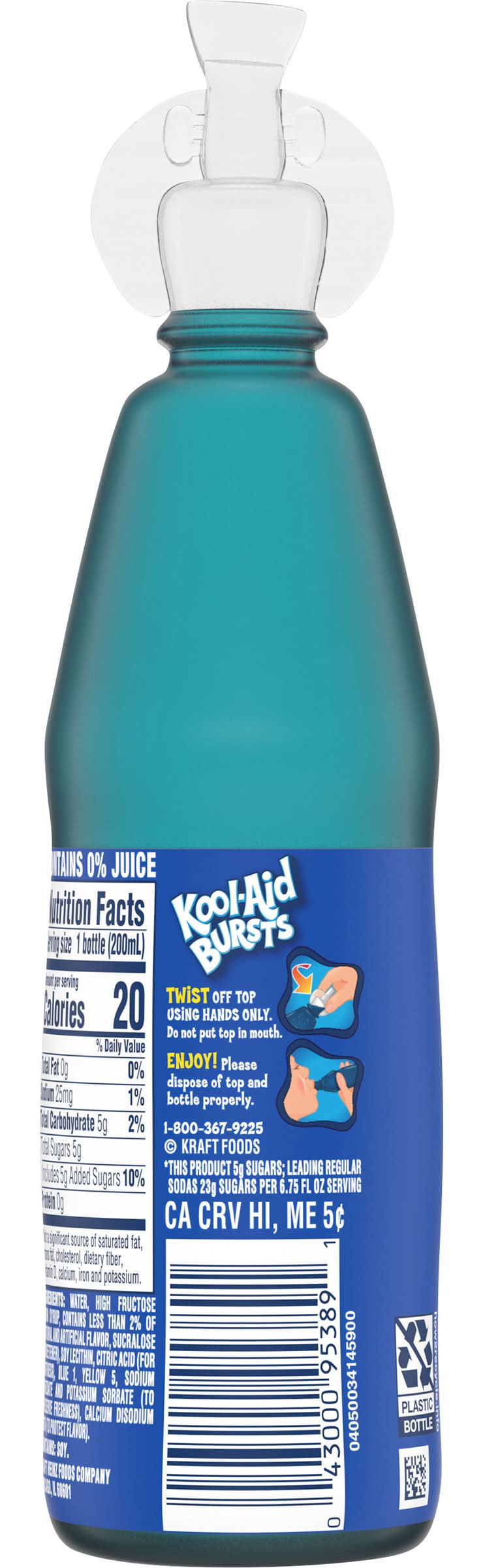 Kool Aid Bursts Berry Blue Ready-To-Drink soft drink is a delicious way to stay hydrated. These ready-to-drink bottled soft drinks make it easy to bring a tasty berry blue flavored drink with you anywhere. Quench your thirst with the refreshingly sweet flavor of berries. With 75% less total sugar than leading regular sodas, this berry flavored drink is always a great choice for the whole family (this has product 5 grams of sugars; leading regular sodas have 23 grams of sugars per 6.75 fl. oz. serving). The 6.75 fluid ounce individually sealed plastic bottle is perfect for bringing on the go. Enjoy a revitalizing berry blue drink at work or at home, or pack them in lunches. Store them in the fridge so they're always cold and ready when you're craving a mouthwatering treat on a hot day. Flavor: Berry blue