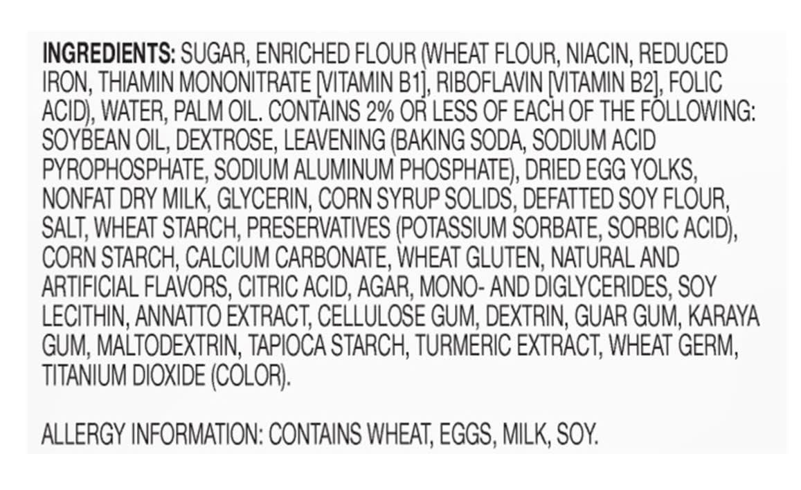 Ingredients: Sugar, Enriched Flour (Wheat Flour, Niacin, Reduced Iron, Thiamin Mononitrate [Vitamin B1], Riboflavin [Vitamin B2], Folic Acid), Water, Palm Oil, Contains 2% or Less of Each of the Following: Soybean Oil, Dextrose, Leavening (Baking Soda, Sodium Acid Pyrophosphate, Sodium Aluminum Phosphate), Dried Egg Yolks, Nonfat Dry Milk, Glycerin, Corn Syrup Solids, Defatted Soy Flour, Salt, Wheat Starch, Preservatives (Potassium Sorbate, Sorbic Acid), Corn Starch, Calcium Carbonate, Wheat Gluten, Natural and Artificial Flavors, Citric Acid, Agar, Mono- and Diglycerides, Soy Lecithin, Annatto Extract, Cellulose Gum, Dextrin, Guar Gum, Karaya Gum, Maltodextrin, Tapioca Starch, Turmeric Extract, Wheat Germ, Titanium Dioxide (Color) Contains: Wheat, Soybeans, Eggs, Milk, Gluten