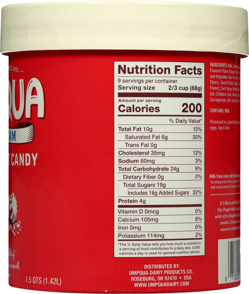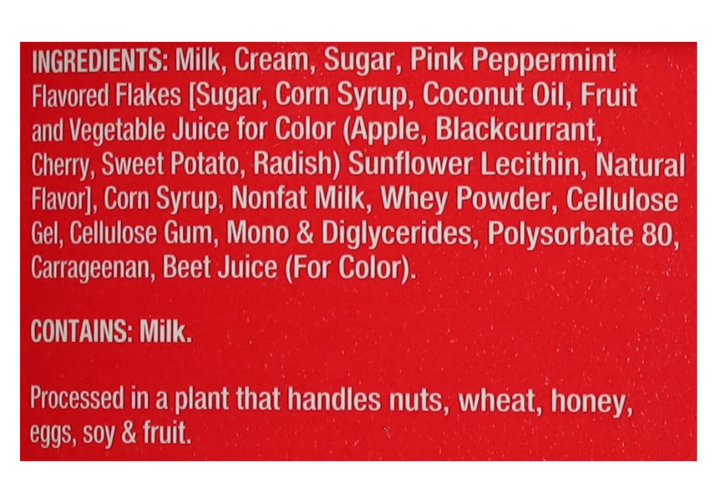 Ingredients: Milk, Cream, Sugar, Pink Peppermint Flavored Flakes [Sugar, Corn Syrup, Coconut Oil, Fruit and Vegetable Juice for Color (Apple, Blackcurrant, Cherry, Sweet Potato, Radish) Sunflower Lecithin, Natural Flavor], Corn Syrup, Nonfat Milk, Whey Powder, Cellulose Gel, Cellulose Gum, Mono & Diglycerides, Polysorbate 80, Carrageenan, Beet Juice (for Color) Contains: Milk, Tree Nuts, Wheat, Eggs, Soybeans
