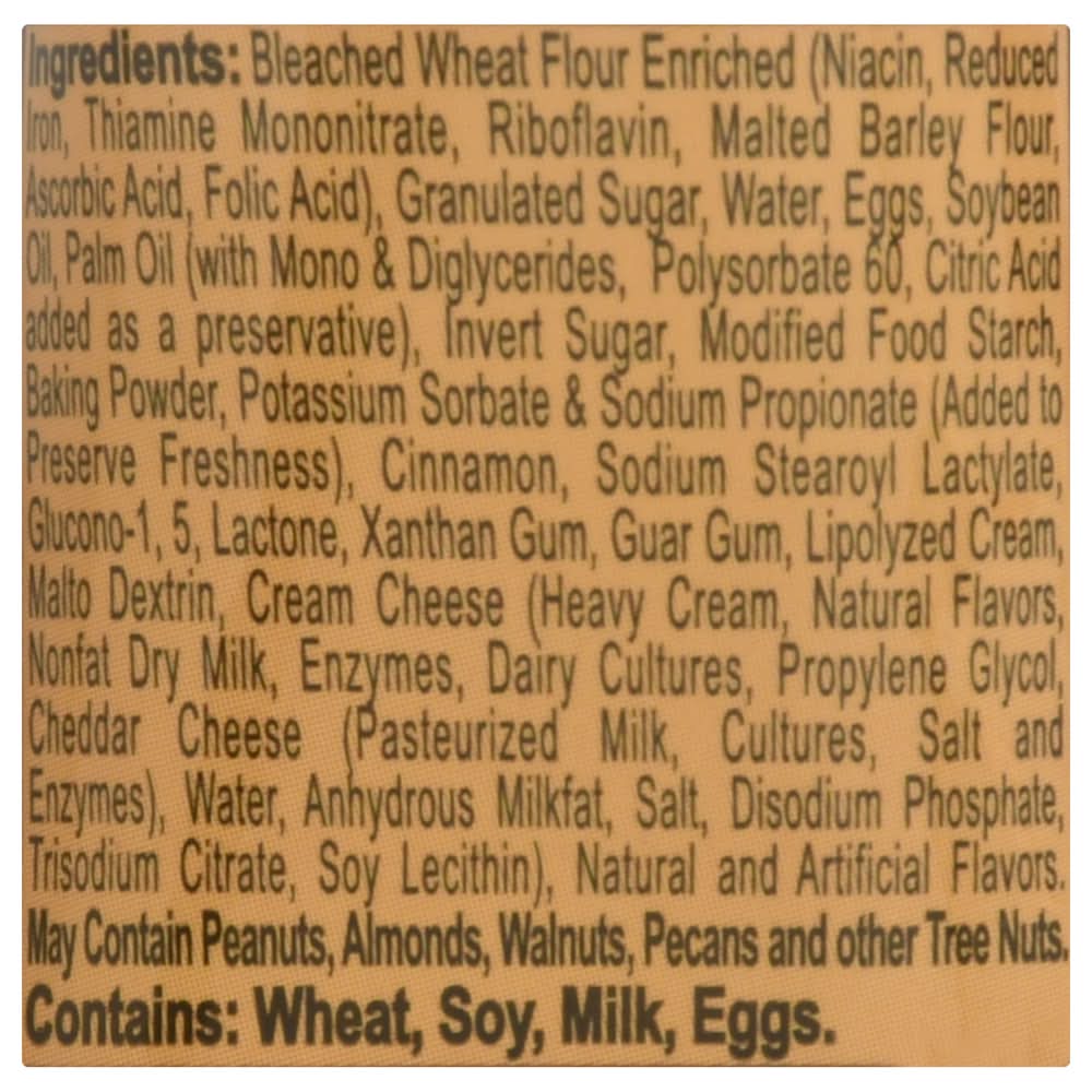 Ingredients: Bleached Wheat Flour Enriched (Niacin, Reduced Iron, Thiamine Mononitrate, Riboflavin, Malted Barley Flour, Ascorbic Acid, Folic Acid), Granulated Sugar, Water, Eggs, Soybean Oil, Palm Oil (with Mono & Diglycerides, Polysorbate 60, Citric Acid Added as a Preservative), Invert Sugar, Modified Food Starch, Baking Powder, Potassium Sorbate & Sodium Propionate (Added to Preserve Freshness), Cinnamon, Cinnamon, Sodium Stearoyl Lactylate, Glucono-1, 5, Lactone, Xanthan Gum, Guar Gum, Lipolyzed Cream, Malto Dextrin, Cream Cheese (Heavy Cream, Natural Flavors, Nonfat Dry Milk, Enzymes, Dairy Cultures, Salt and Enzymes), Water, Anhydrous Milkfat, Salt, Disodium Phosphate, Trisodium Citrate, Soy Lecithin), Natural and Artificial Flavors Contains: Wheat, Soybeans, Milk, Eggs, Peanuts, Tree Nuts