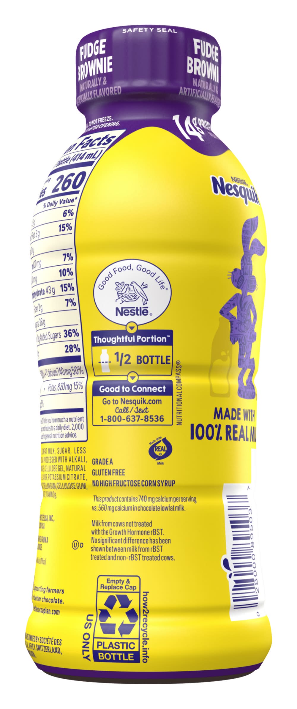 Nesquik Fudge Brownie Lowfat Milk offers 100% real milk for a classic, delicious taste in an irresistibly tasty and nutritious drink. This fudge brownie lowfat milk contains no high fructose corn syrup, for delicious goodness that will deliver on the classic Nesquik chocolate milk taste you love. Nesquik Fudge Brownie Lowfat Milk is ready to drink, so it's easy to serve with meals, or as a delicious chocolate drink on its own. This fudge brownie lowfat milk comes in a convenient resealable bottle, easy to take on the go. Containing 14 grams of protein per bottle from 100% real milk and Vitamin A and Vitamin D, Nesquik Fudge Brownie Lowfat Milk also offers 30% more calcium than regular chocolate lowfat milk. Shake well before enjoying, and keep refrigerated after opening.