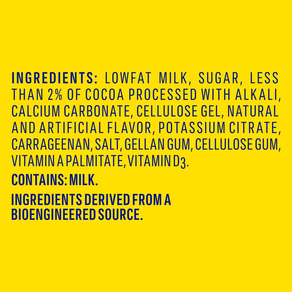 Ingredients: LOWFAT MILK, SUGAR, LESS THAN 2% OF COCOA PROCESSED WITH ALKALI, CALCIUM CARBONATE, CELLULOSE GEL, NATURAL AND ARTIFICIAL FLAVOR, POTASSIUM CITRATE, CARRAGEENAN, SALT, GELLAN GUM, CELLULOSE GUM, VITAMIN A PALMITATE, VITAMIN D3. Contains: CONTAINS: MILK.