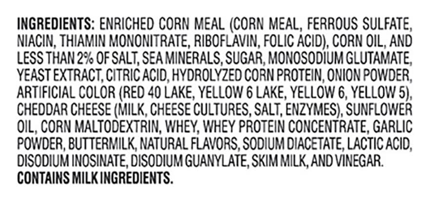 Ingredients: Enriched Corn Meal (Corn Meal, Ferrous Sulfate, Niacin, Thiamin Mononitrate, Riboflavin, Folic Acid), Corn Oil, and Less than 2% of Salt, Sea Minerals, Sugar, Monosodium Glutamate, Yeast Extract, Citric Acid, Hydrolyzed Corn Protein, Onion Powder, Artificial Color (Red 40 Lake, Yellow 6 Lake, Yellow 6, Yellow 5), Cheddar Cheese (Milk, Cheese Cultures, Salt, Enzymes), Sunflower Oil, Corn Maltodextrin, Whey, Whey Protein Concentrate, Garlic Powder, Buttermilk, Natural Flavors, Sodium Diacetate, Lactic Acid, Disodium Inosinate, Disodium Guanylate, Skim Milk, and Vinegar Contains: Milk