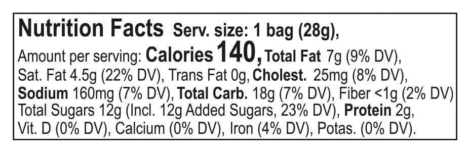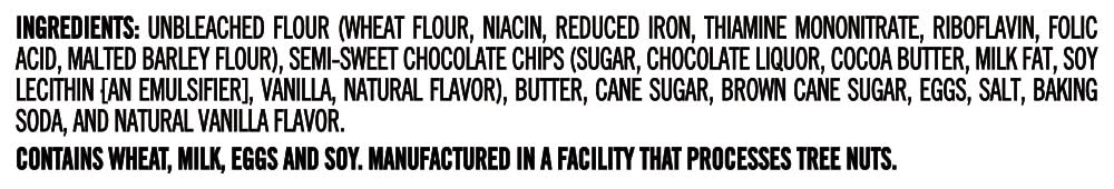 Ingredients: INGREDIENTS: Unbleached flour (wheat flour, niacin, reduced iron, thiamine mononitrate, riboflavin, folic acid, malted barley flour), Semi-sweet chocolate chips (sugar, chocolate liquor, cocoa butter, milkfat, soy lecithin [an emulsifier], natural flavors), Butter, Sugar, Brown sugar, Eggs, Salt, Baking soda, Natural flavor. Contains: Wheat, Milk, Eggs and Soy. May contain tree nuts. Contains: Contains: Wheat, Milk, Eggs and Soy. May contain tree nuts.