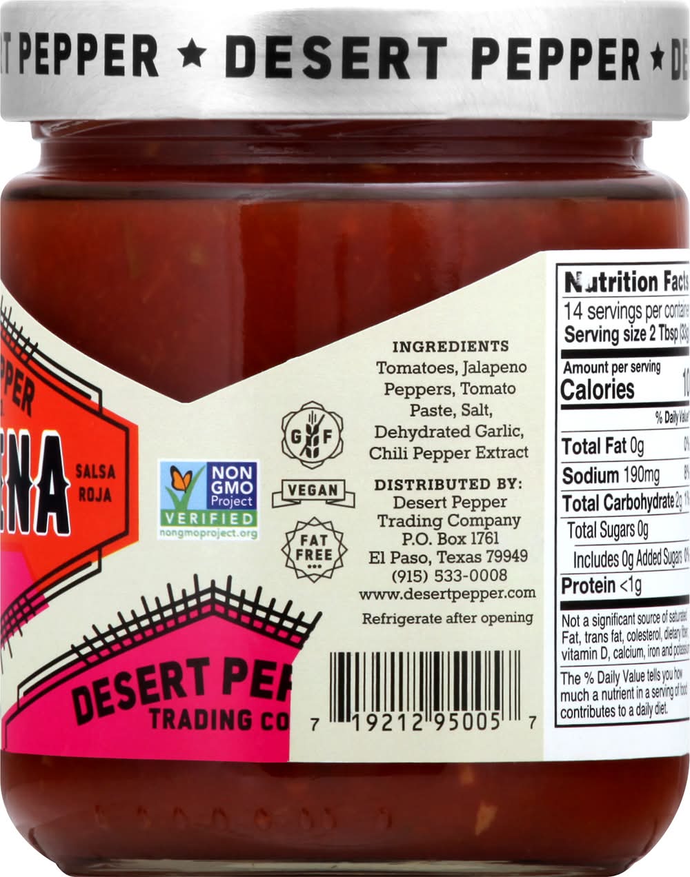 Gluten free. Vegan. Fat free. Non GMO Project verified. Authentic recipe. Cantina hot red salsa has a fire that is undeniable, and yet so hard to resist. It's perfectly balanced, accentuating foods in all the right ways. This is salsa in its purest form. Desert Pepper Trading Co., PO Box 1761 , El Paso , TX , 79949