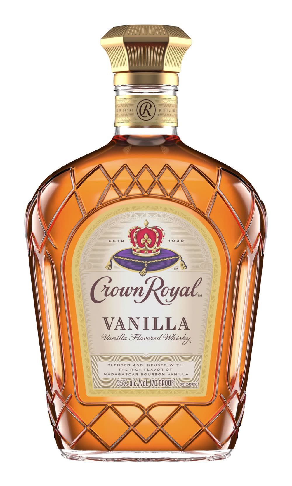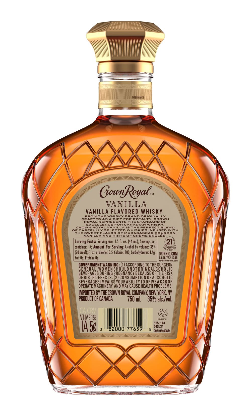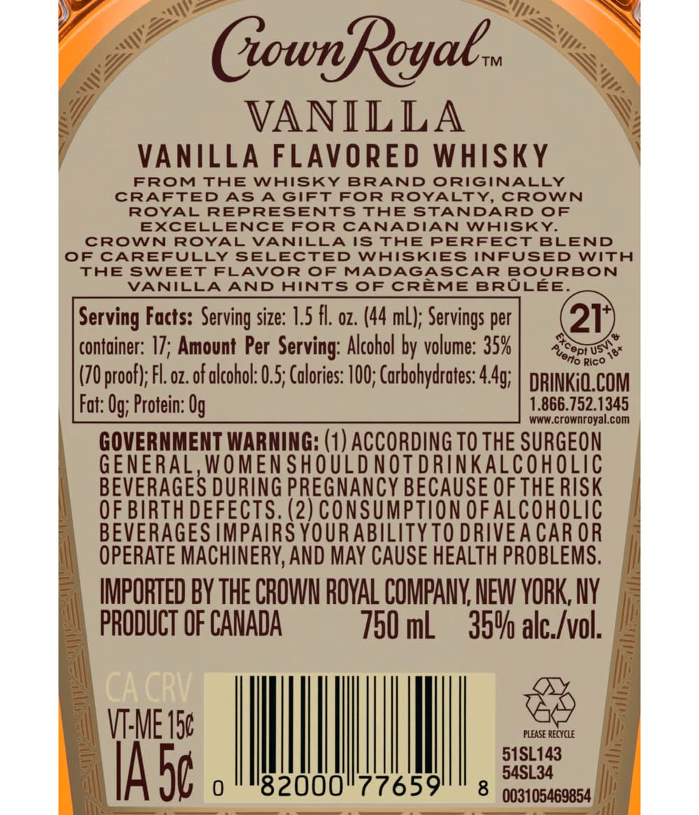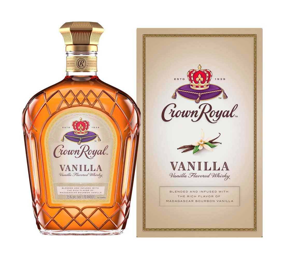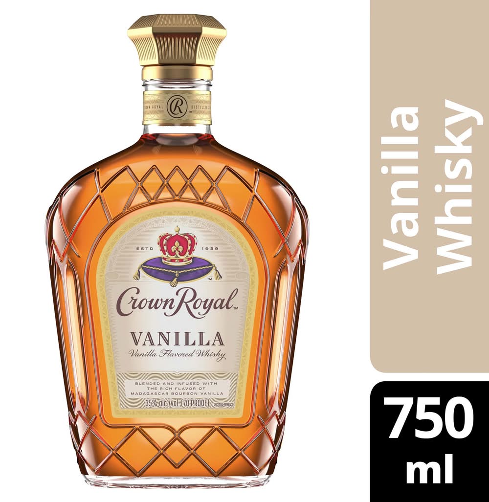With strong notes of rich vanilla, our 70 proof whisky provides a refined and rich flavor. Made with the signature smoothness of traditional Crown Royal, our whisky is matured to perfection and will enhance any cocktail party or celebration. Perfect for a Vanilla Lager cocktail. Includes one 70 proof. Please drink responsibly. • Flavor: Vanilla • Alcohol by volume: 35% • The Crown Royal Company, Norwalk, Ct. • Packaging: Reusable