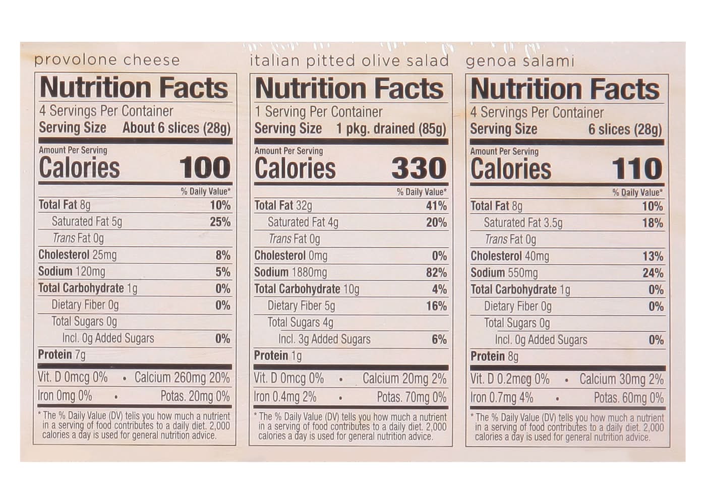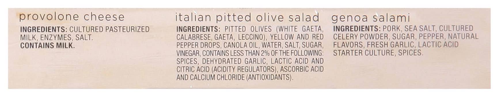 Ingredients: Provolone Cheese: Cultured Pasteurized Milk, Enzymes, Salt. Italian Pitted Olive Salad: Pitted Olives (White Gaeta, Calabrese, Gaeta, Leccino), Yellow and Red Pepper Drops, Canola Oil, Water, Salt, Sugar, Vinegar, Contains Less than 2% of the Following: Spices, Dehydrated Garlic, Lactic Acid and Citric Acid (Acidity Regulators), Ascorbic Acid and Calcium Chloride (Antioxidants). Genoa Salami: Pork, Sea Salt, Cultured Celery Powder, Sugar, Pepper, Natural Flavors, Fresh Garlic, Lactic Acid Starter Culture, Spices Contains: Milk