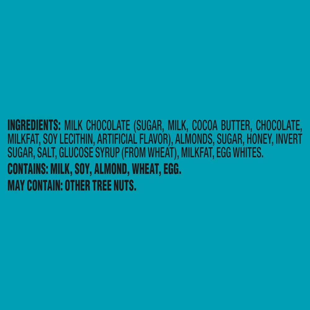 Ingredients: Milk Chocolate (Sugar Milk Cocoa Butter Chocolate Milkfat Soy Lecithin-an Emulsifier Vanillin-an Artificial Flavor) Almonds Sugar Honey Invert Sugar Glucose Syrup Salt Milkfat Egg Whites. Contains: Milk, Soybeans, Tree Nuts, Eggs