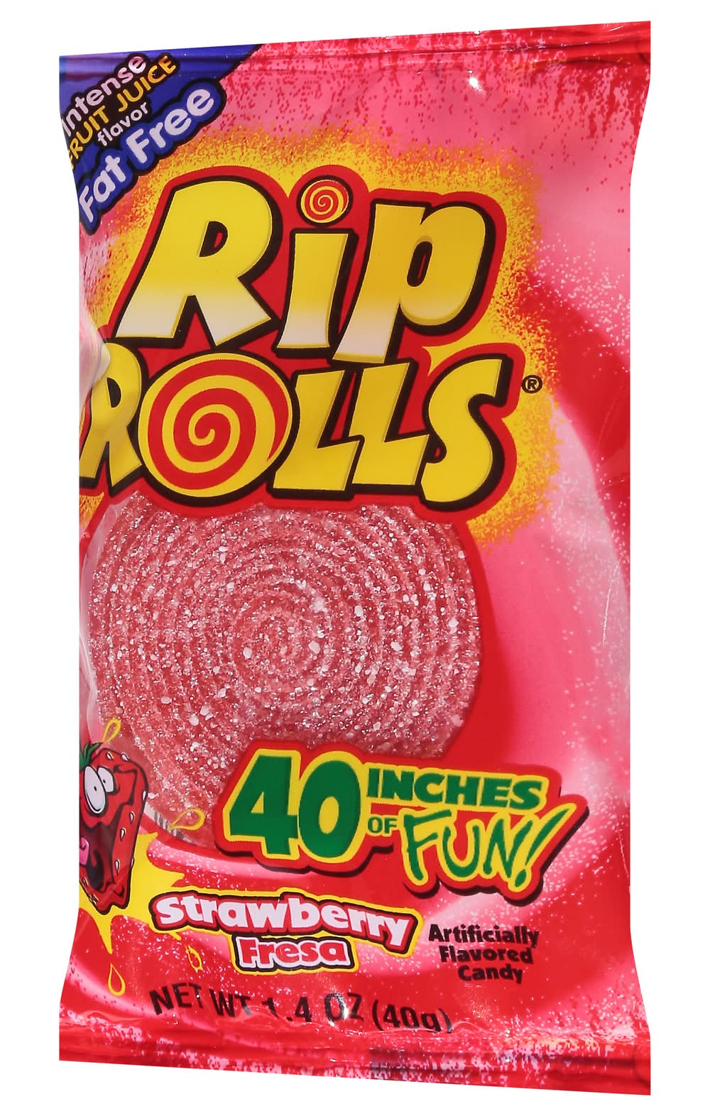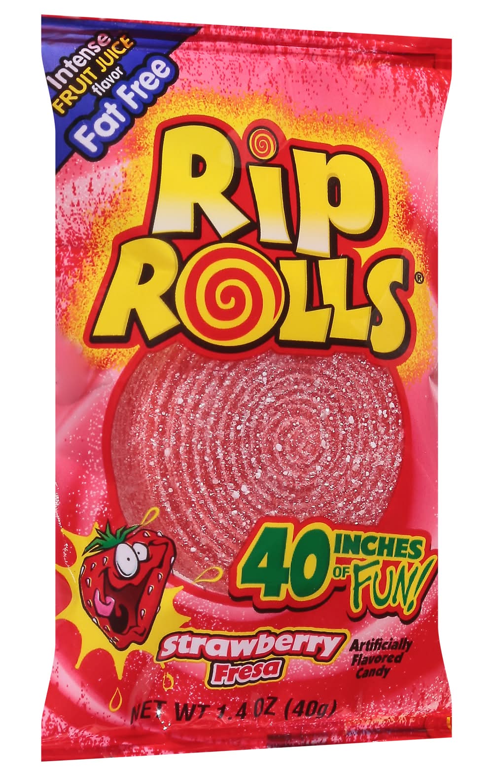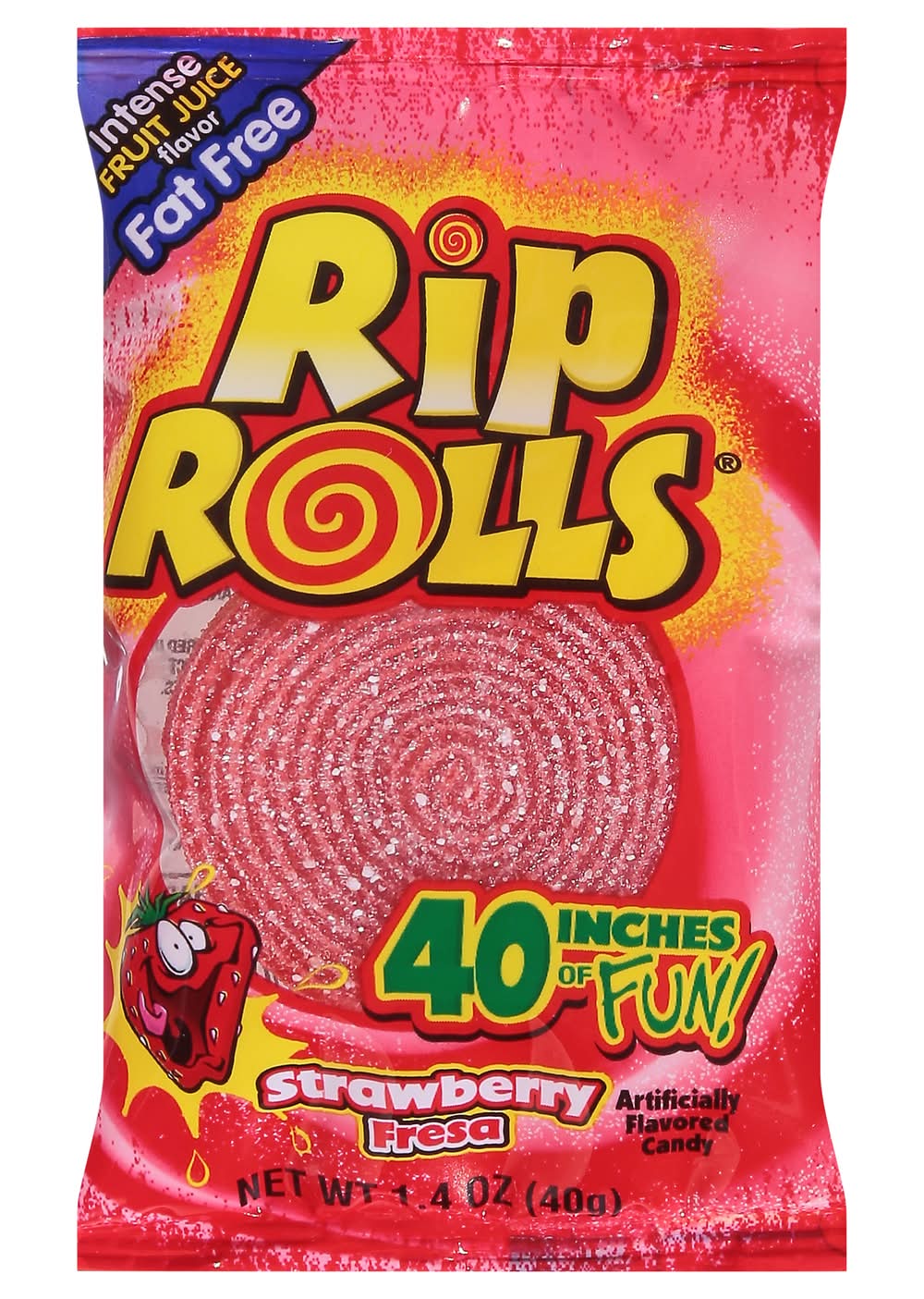 Intense fruit juice flavored. Artificially flavored candy. Fat free. 40 inches of fun! Let'er rip! Whit it; Strip it; Smack it; Pack it; Curl it; Twirl it; Stretch it; Catch it; Pull it. What do you do with your Rip Rolls. Questions or comments? Toll free 1-877-937-8322. Product of Thailand. • Brand: Rip rolls • Flavor: Strawberry • Size: 40 inch