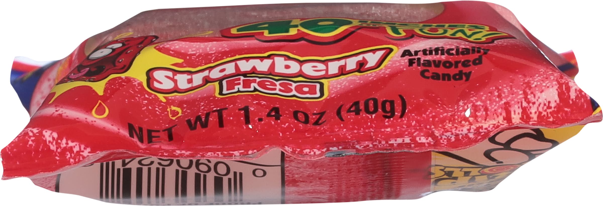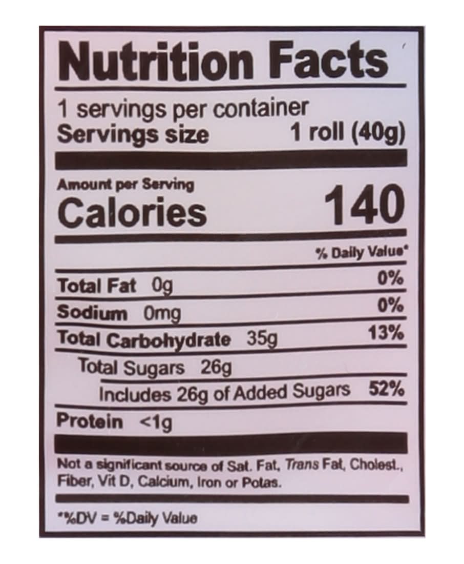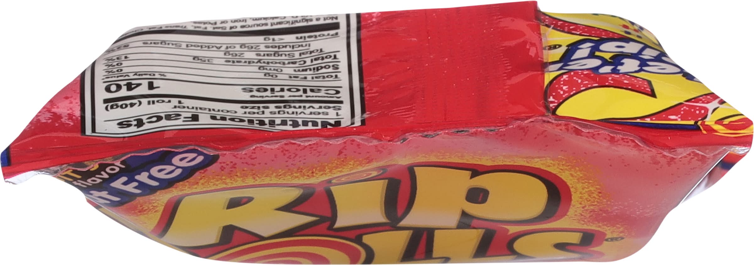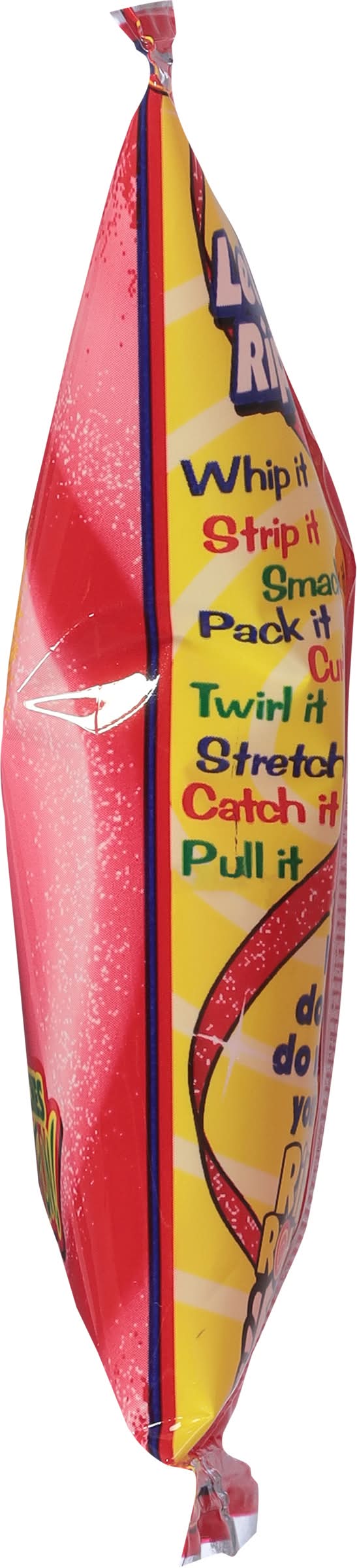 Intense fruit juice flavored. Artificially flavored candy. Fat free. 40 inches of fun! Let'er rip! Whit it; Strip it; Smack it; Pack it; Curl it; Twirl it; Stretch it; Catch it; Pull it. What do you do with your Rip Rolls. Questions or comments? Toll free 1-877-937-8322. Product of Thailand. • Brand: Rip rolls • Flavor: Strawberry • Size: 40 inch