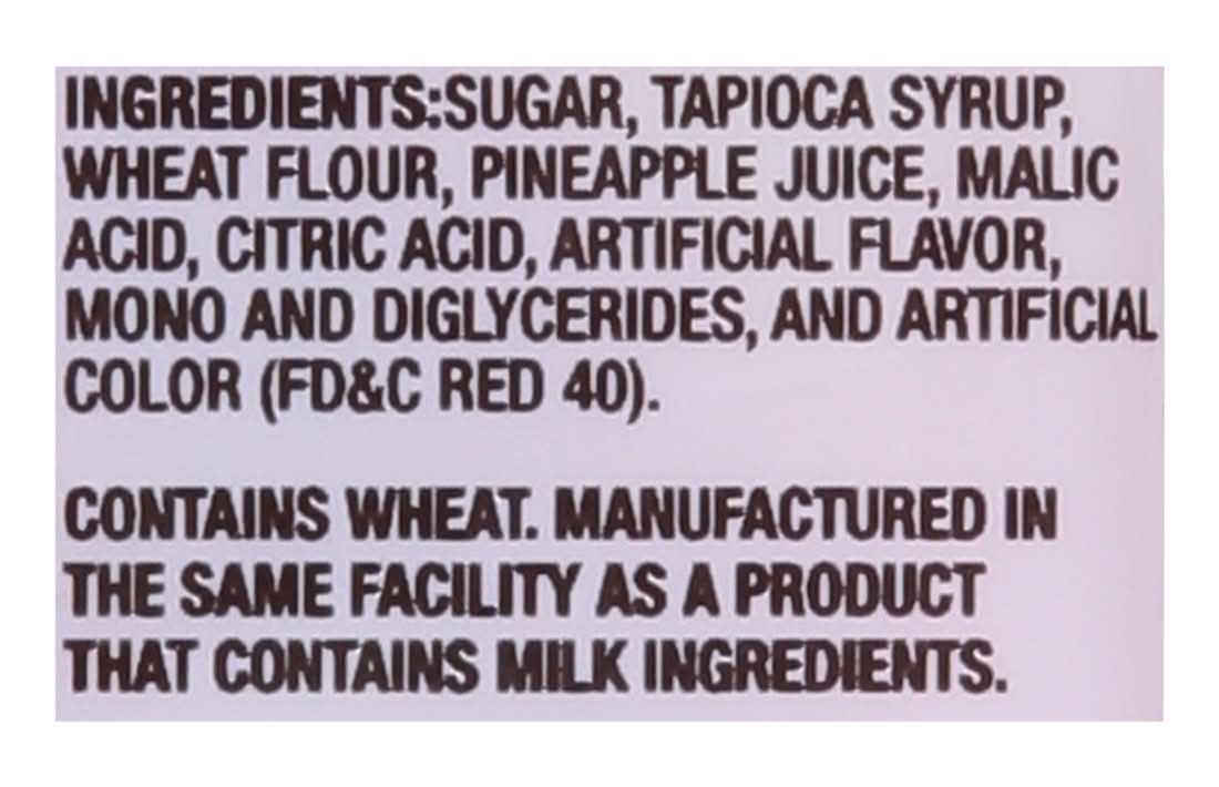 Ingredients: Sugar Tapioca Syrup Wheat Flour Pineapple Juice Malic Acid Citric Acid Artificial Flavor Mono and Diglycerides and Artificial Color (FD&C Red 40). Contains: Wheat