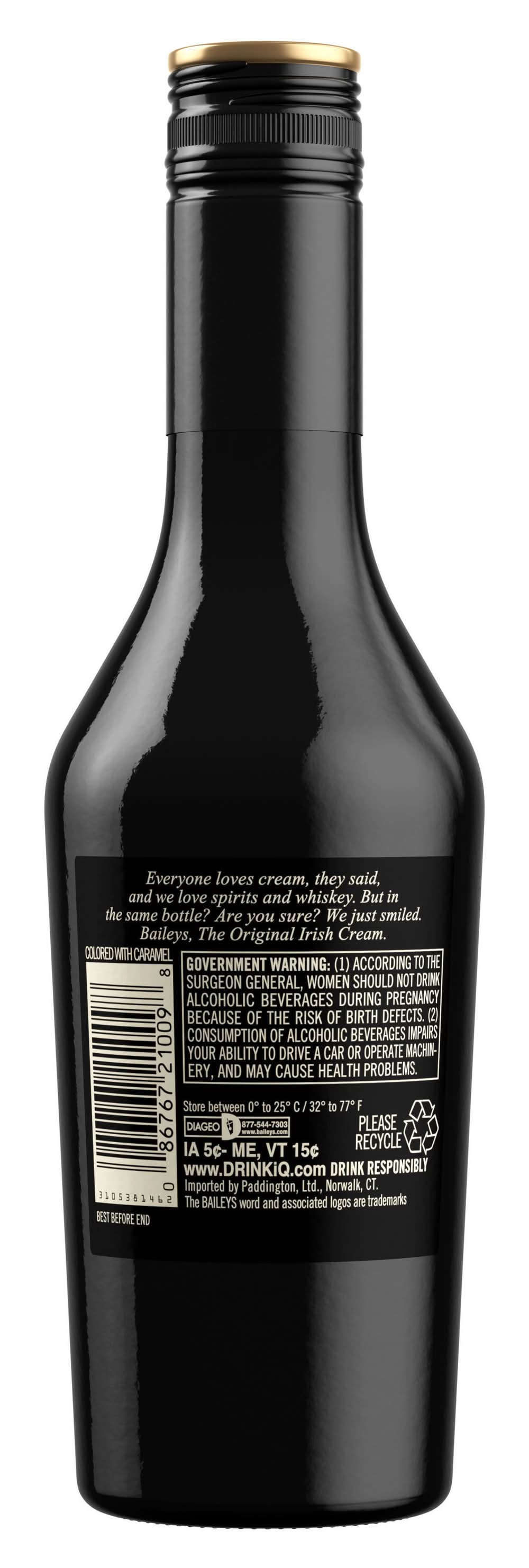Baileys Original Irish Cream Liqueur is the world's number one Irish cream liqueur, a perfect blend of fine Irish whiskey, spirits, Irish dairy cream, and sumptuous chocolate and vanilla flavors. With its distinct velvety texture and perfect combination of smooth cream and Irish whiskey, it invites you to enjoy it neat, over ice, or as a delicious addition to your favorite coffee. And if you're looking for more ways to indulge, from gooey Baileys Irish Cream Cheesecake to classy Baileys Espresso Martini, Baileys recipes hit the sweet spot every time. Drawing on traditional Irish dairy and distillation practices, this distinctive blend required four years to achieve perfection, culminating in the ultimate liquid treat. Please drink responsibly. • Alcohol by volume: 17% • Packaging: Reusable