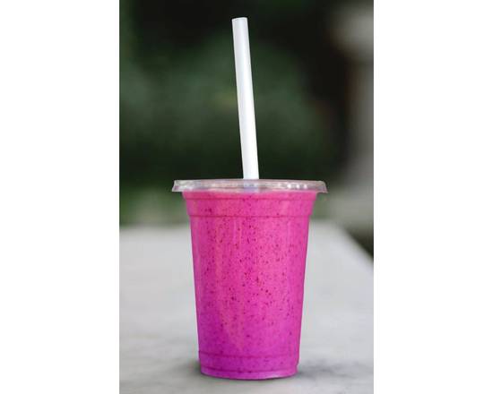 Dragon fruit, strawberry, pineapple, agave, and almond milk. Topped with goji berries.