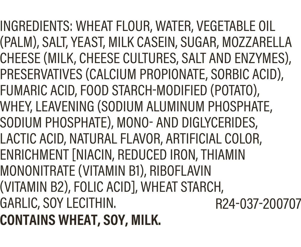 Ingredients: WHEAT FLOUR, WATER, VEGETABLE OIL (PALM), SALT, YEAST, MILK CASEIN, SUGAR, MOZZARELLA CHEESE [MILK, CHEESE CULTURE, SALT, ENZMYES], PRESERVATIVES [CALCIUM PROPIONATE, SORBIC ACID], FUMARIC ACID, FOOD STARCH MODIFIED (POTATO), WHEY, LEAVENING [SODIUM ALUMINUM PHOSPHATE, SODIUM PHOSPHATE], MONO- AND DIGLYCERIDES, LACTIC ACID, NATURAL FLAVOR, ARTIFICIAL COLORS, ENRICHMENT [NIACIN, REDUCED IRON, THIAMIN MONONITRATE, RIBOFLAVIN, FOLIC ACID], WHEAT STARCH, GARLIC, SOY LECITHIN. Contains: CONTAINS MILK, SOY, WHEAT.