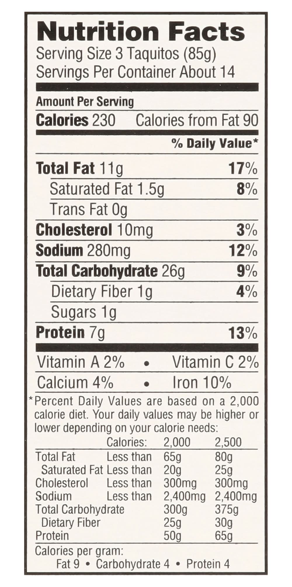 7 g protein per serving. Contains a bioengineered food. Family owned since 1964. America's no.1 flour taquito*. Cook & serve. Microwaveable. *Source: IRI POS Data ending 5/16/21. Satisfaction Burritos; Meals; Taquitos. ...And more. Paperboard packaging. Recyclable. Packaging: Reusable