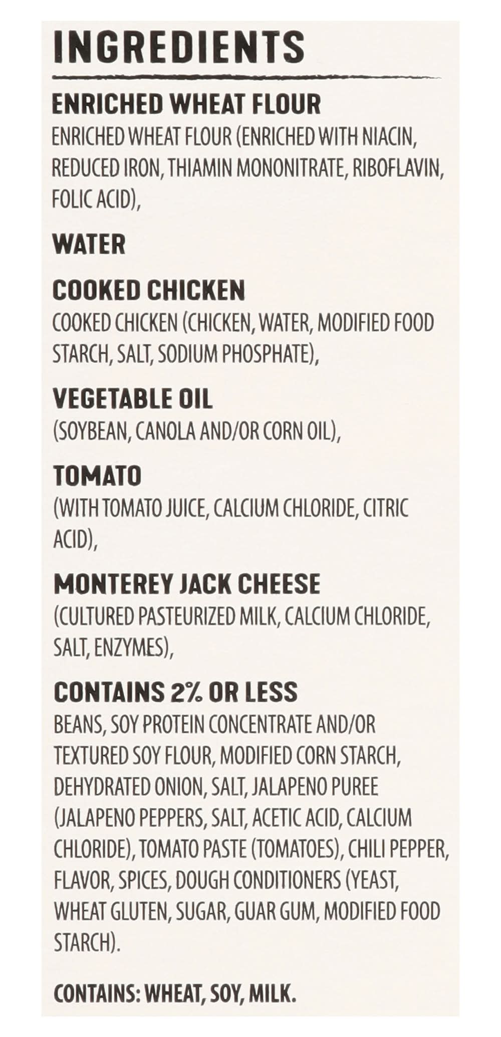 Ingredients: Enriched Wheat Flour Enriched Wheat Flour (Enriched with Niacin, Reduced Iron, Thiamin Mononitrate, Riboflavin, Folic Acid), Water, Cooked Chicken: Cooked Chicken (Chicken, Water, Modified Food Starch, Salt, Sodium Phosphate), Vegetable Oil (Soybean, Canola and/or Corn Oil), Tomato (with Tomato Juice, Calcium Chloride, Citric Acid), Monterey Jack Cheese (Cultured Pasteurized Milk, Calcium Chloride, Salt, Enzymes), Contains 2% or Less Beans, Soy Protein Concentrate and/or Textured Soy Flour, Modified Corn Starch, Dehydrated Onion, Salt, Jalapeno Puree (Jalapeno Peppers, Salt, Acetic Acid, Calcium Chloride), Tomato Paste (Tomatoes), Chili Pepper, Flavor, Spices, Dough Conditioners (Yeast, Wheat Gluten, Sugar, Guar Gum, Modified Food Starch) Contains: Wheat, Soybeans, Milk, Gluten