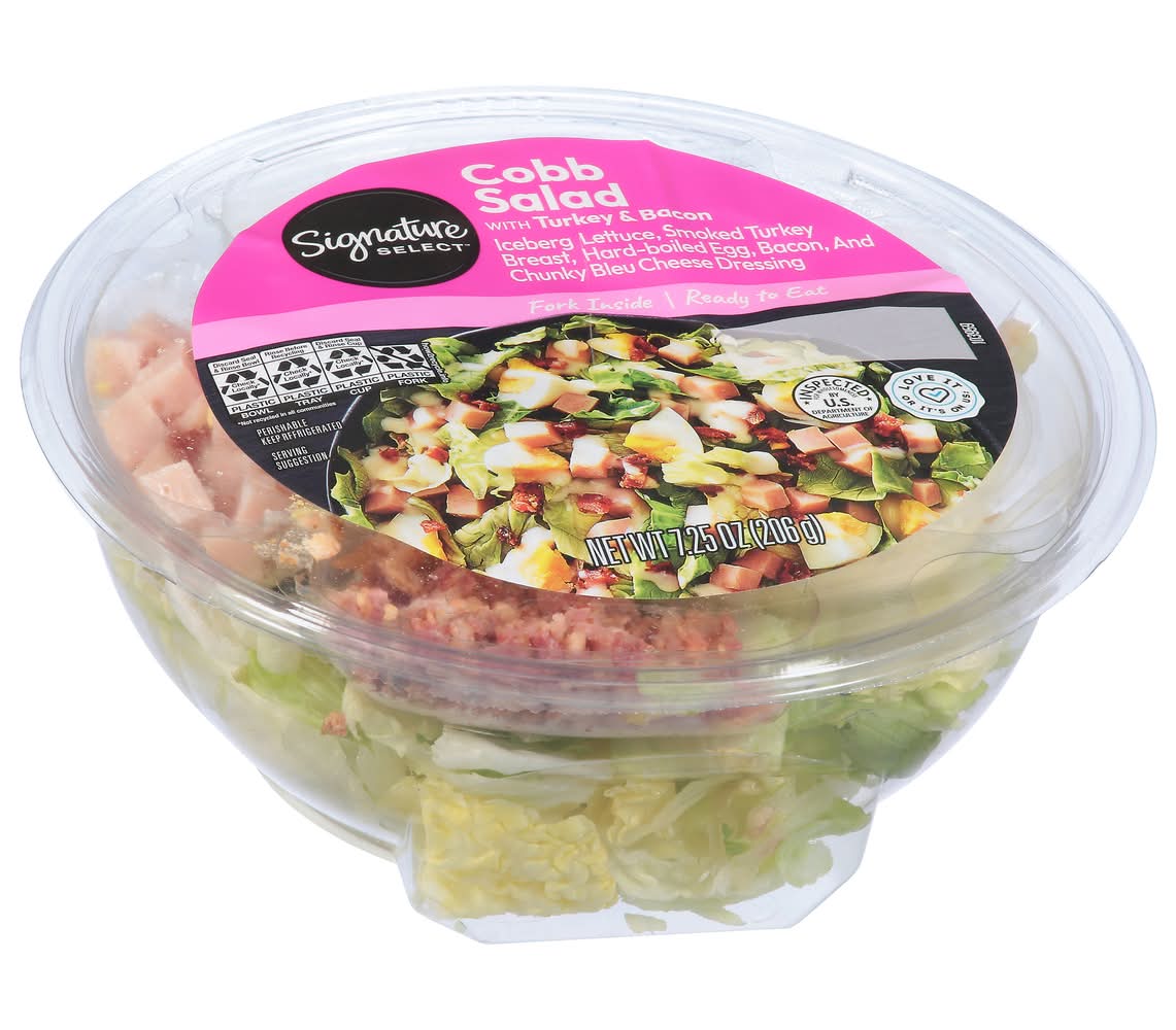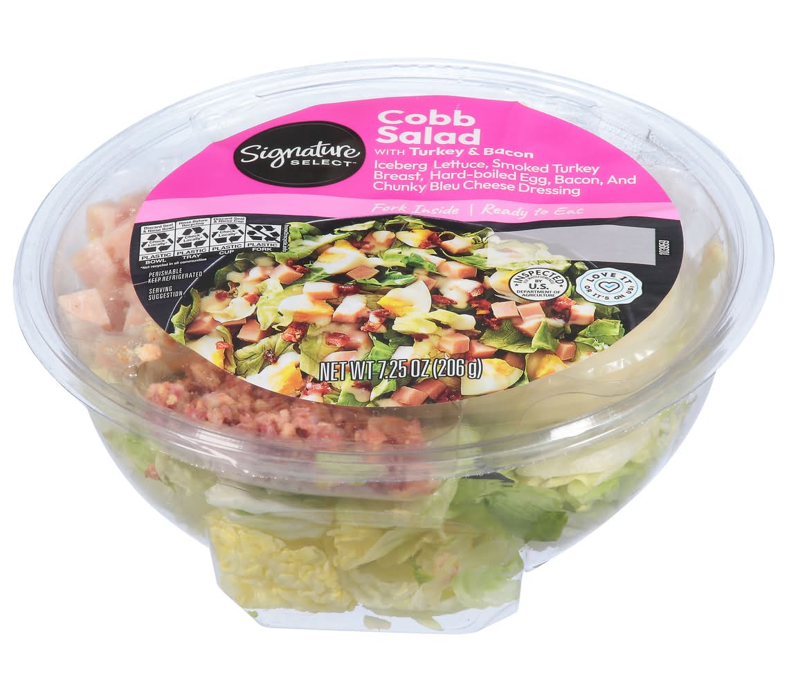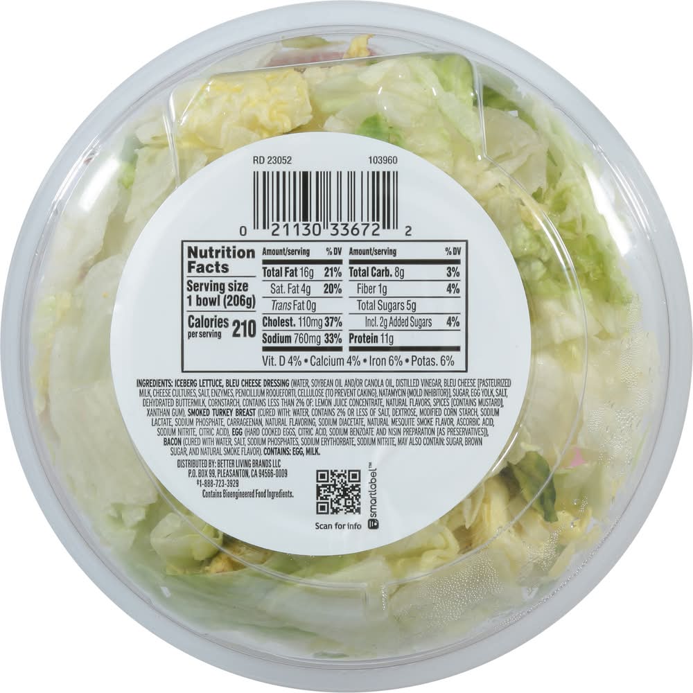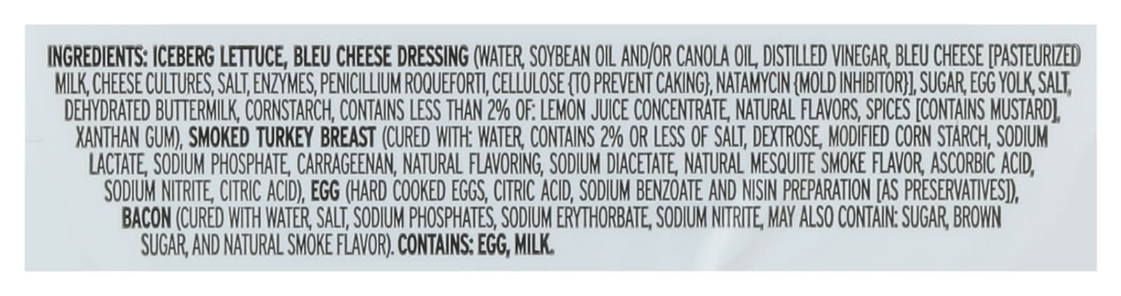 Ingredients: Iceberg Lettuce, Bleu Cheese Dressing (Water, Soybean Oil and/or Canola Oil Distilled Vinegar Bleu Cheese [Pasteurized Milk, Cheese Cultures, Salt, Enzymes, Penicillium Roqueforti, Cellulose {to Prevent Caking}, Natamycin (Mold Inhibitor)), Sugar Egg Yolk, Salt, Dehydrated Buttermilk Cornstarch, Contains Less than 2% of Lemon Juice Concentrate, Natural Flavors Spices [Contains Mustard], Xanthan Gum) Smoked Turkey Breast (Cured with: Water, Contains 2% or Less of Salt, Dextrose, Modified Corn Starch, Sodium Lactate, Sodium Phosphate, Carrageenan, Natural Flavoring, Sodium Diacetate, Natural Mesquite Smoke Flavor Ascorbic Acid, Sodium Nitrite, Citric Acid), Egg (Hard Cooked Eggs, Citric Acid, Sodium Benzoate and Nisin Preparation [as Preservatives)), Bacon (Cured with Water, Salt, Sodium Phosphates, Sodium Erythorbate, Sodium Nitrite, May Also Contain: Sugar Brown Sugar and Natural Smoke Flavor). Contains: Eggs, Milk, Soybeans, Corn, Mustard