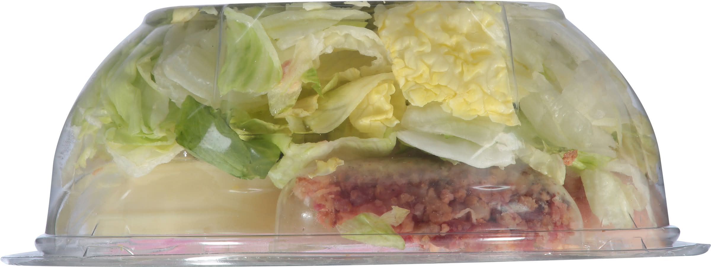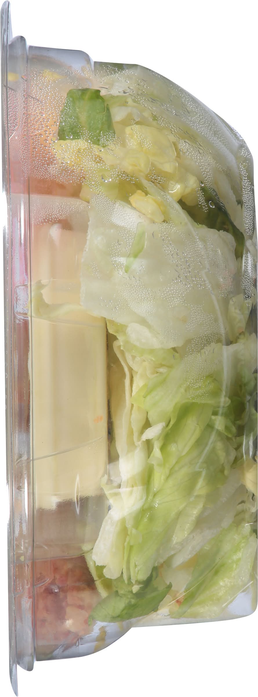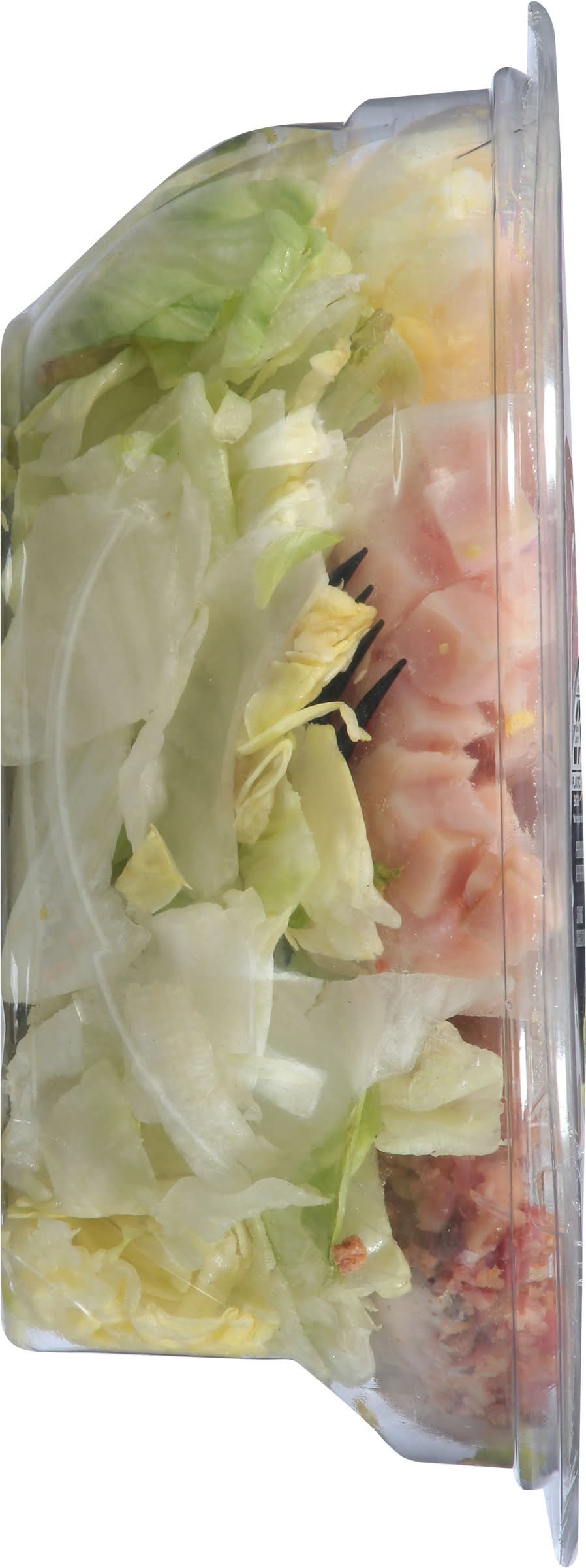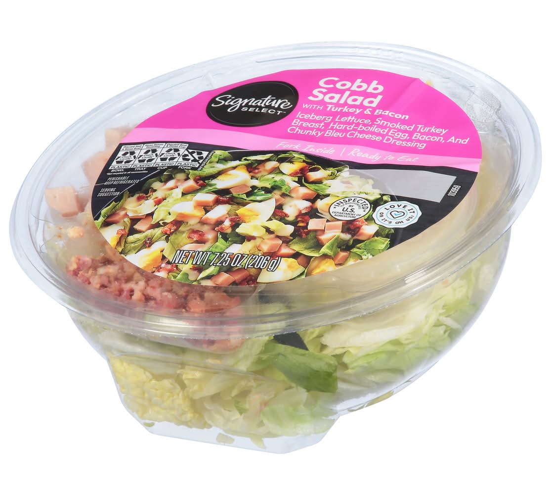Ingredients: Iceberg Lettuce, Bleu Cheese Dressing (Water, Soybean Oil and/or Canola Oil Distilled Vinegar Bleu Cheese [Pasteurized Milk, Cheese Cultures, Salt, Enzymes, Penicillium Roqueforti, Cellulose {to Prevent Caking}, Natamycin (Mold Inhibitor)), Sugar Egg Yolk, Salt, Dehydrated Buttermilk Cornstarch, Contains Less than 2% of Lemon Juice Concentrate, Natural Flavors Spices [Contains Mustard], Xanthan Gum) Smoked Turkey Breast (Cured with: Water, Contains 2% or Less of Salt, Dextrose, Modified Corn Starch, Sodium Lactate, Sodium Phosphate, Carrageenan, Natural Flavoring, Sodium Diacetate, Natural Mesquite Smoke Flavor Ascorbic Acid, Sodium Nitrite, Citric Acid), Egg (Hard Cooked Eggs, Citric Acid, Sodium Benzoate and Nisin Preparation [as Preservatives)), Bacon (Cured with Water, Salt, Sodium Phosphates, Sodium Erythorbate, Sodium Nitrite, May Also Contain: Sugar Brown Sugar and Natural Smoke Flavor). Contains: Eggs, Milk, Soybeans, Corn, Mustard