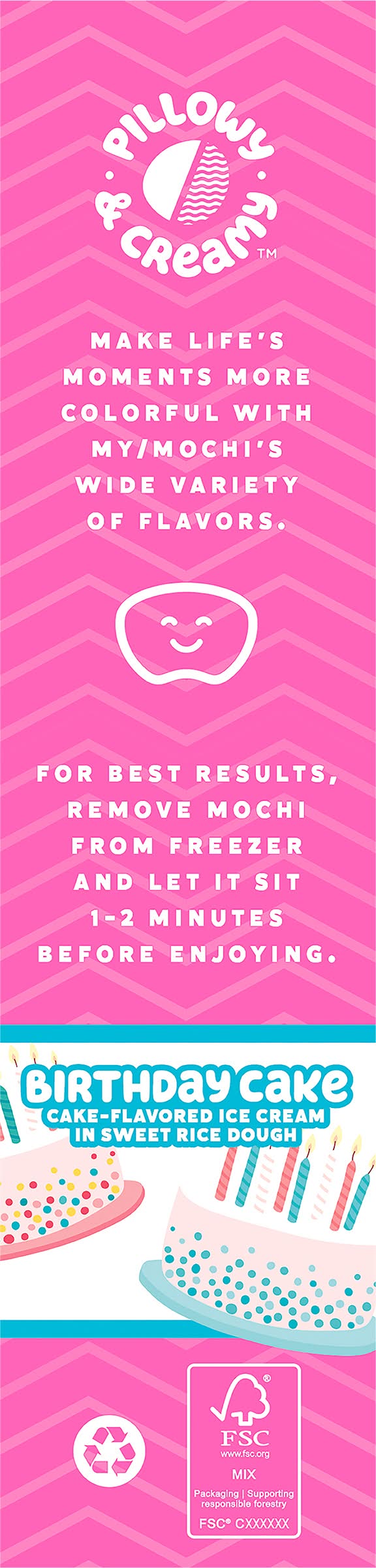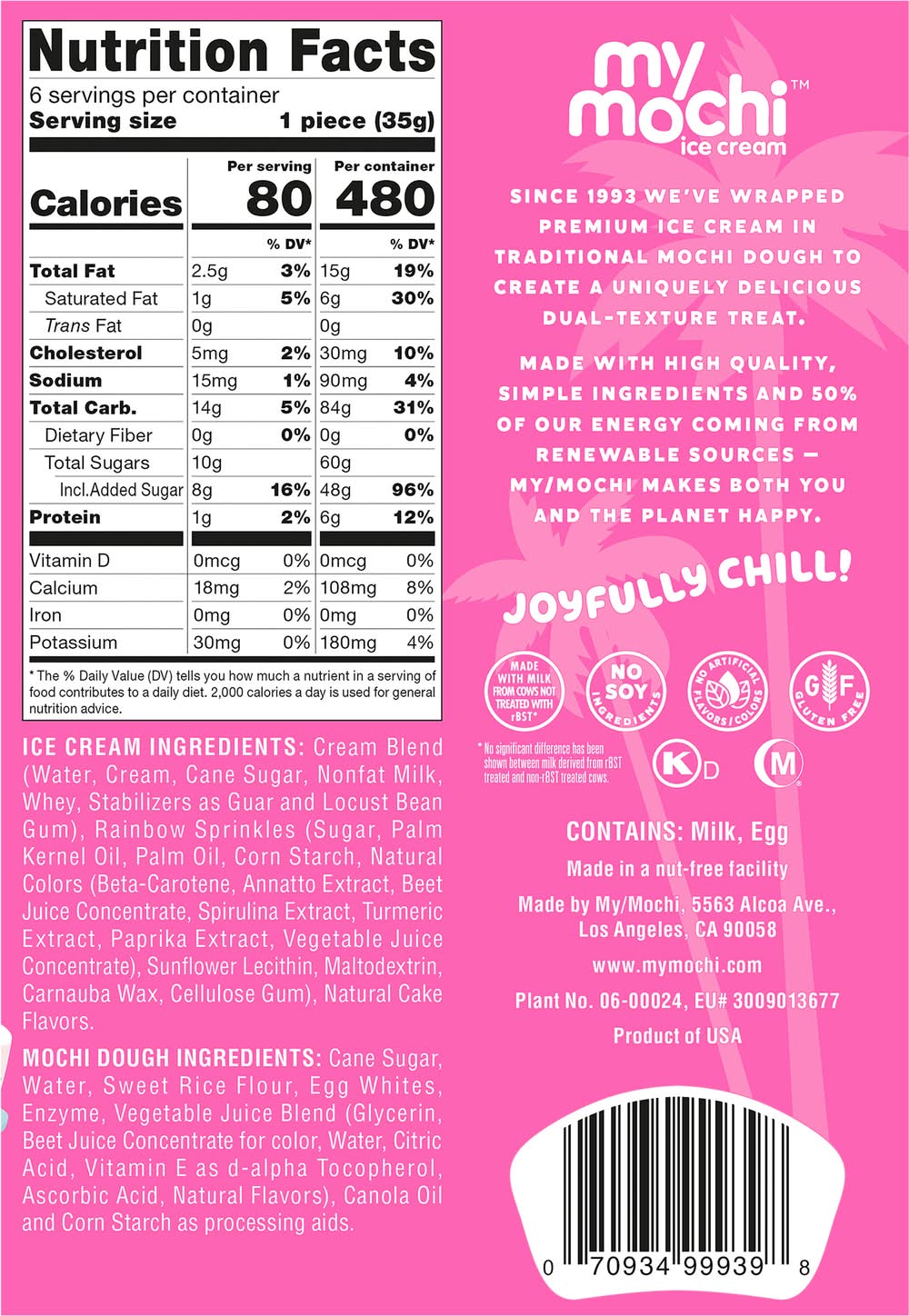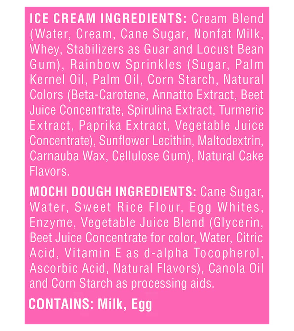 Ingredients: Ice Cream Ingredients: Cream Blend (Water, Cream, Cane Sugar, Nonfat Milk, Whey, Stabilizers as Guar and Locust Bean Gum), Rainbow Sprinkles (Sugar, Palm Kernel Oil, Palm Oil, Corn Starch, Natural Colors (Beta-Carotene, Annatto Extract, Beet Juice Concentrate, Spirulina Extract, Turmeric Extract, Paprika Extract, Vegetable Juice Concentrate), Sunflower Lecithin, Maltodextrin, Carnauba Wax, Cellulose Gum), Natural Cake Flavors, Mochi Dough Ingredients: Cane Sugar, Water, Sweet Rice Flour, Egg Whites, Enzyme, Vegetable Juice Blend (Glycerin, Beet Juice Concentrate for Color, Water, Citric Acid, Vitamin E as D-Alpha Tocopherol, Ascorbic Acid, Natural Flavors), Canola Oil and Corn Starch as Processing Aids Contains: Milk, Eggs