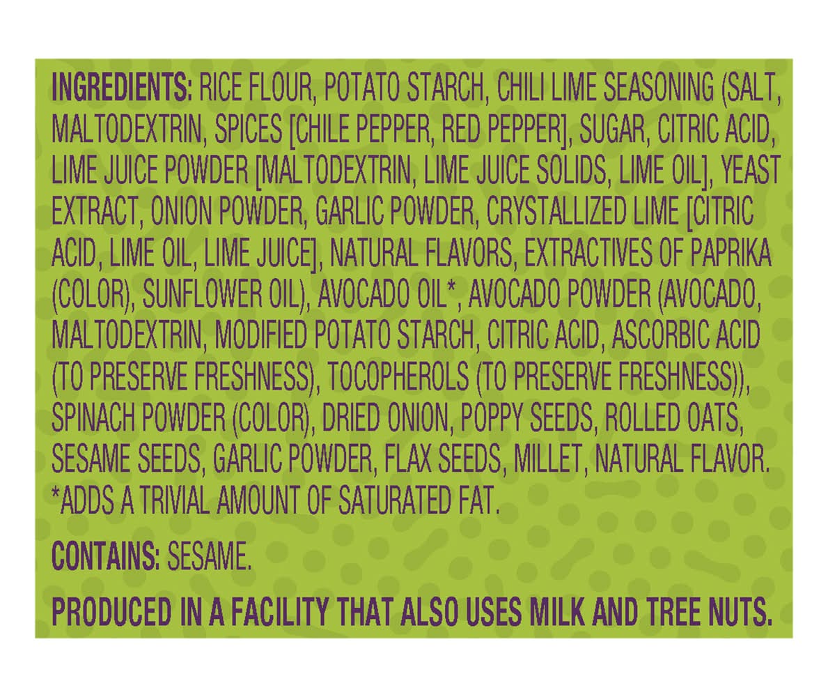 Ingredients: Rice Flour, Potato Starch, Chili Lime Seasoning (Salt, Maltodextrin, Spices [Chile Pepper, Red Pepper], Sugar, Citric Acid, Lime Juice Powder [Maltodextrin, Lime Juice Solids, Lime Oil], Yeast Extract, Onion Powder, Garlic Powder, Crystallized Lime [Citric Acid, Lime Oil, Lime Juice], Natural Flavors, Extractives of Paprika (Color), Sunflower Oil), Avocado Oil*, Avocado Powder (Avocado, Maltodextrin, Modified Potato Starch, Citric Acid, Ascorbic Acid (to Preserve Freshness), Tocopherols (to Preserve Freshness)), Spinach Powder (Color), Dried Onion, Poppy Seeds, Rolled Oats, Sesame Seeds, Garlic Powder, Flax Seeds, Millet, Natural Flavor. * Adds a Trivial Amount of Saturated Fat Contains: Oat, Sesame, Milk, Tree Nuts