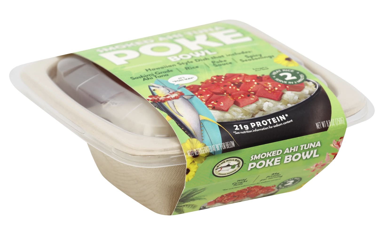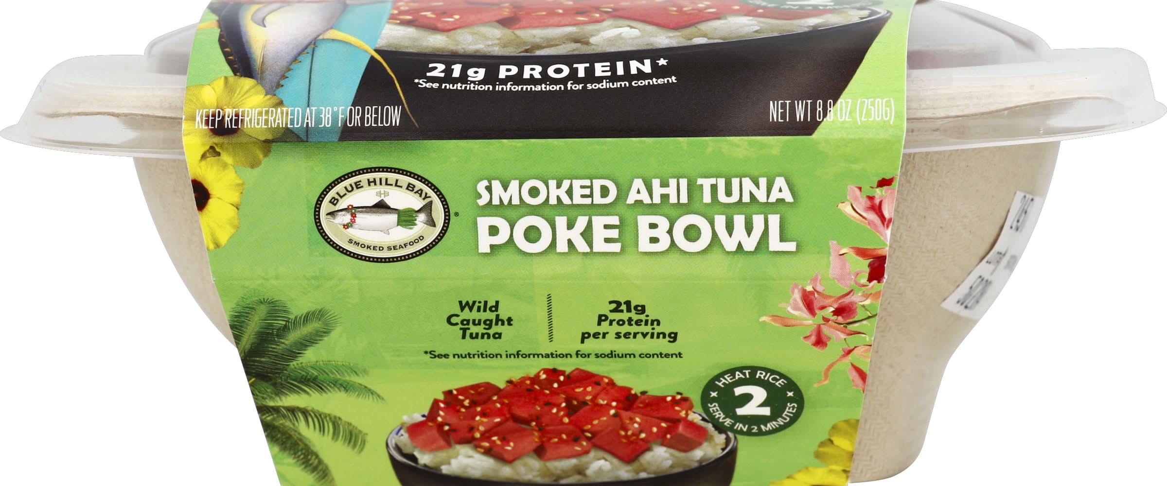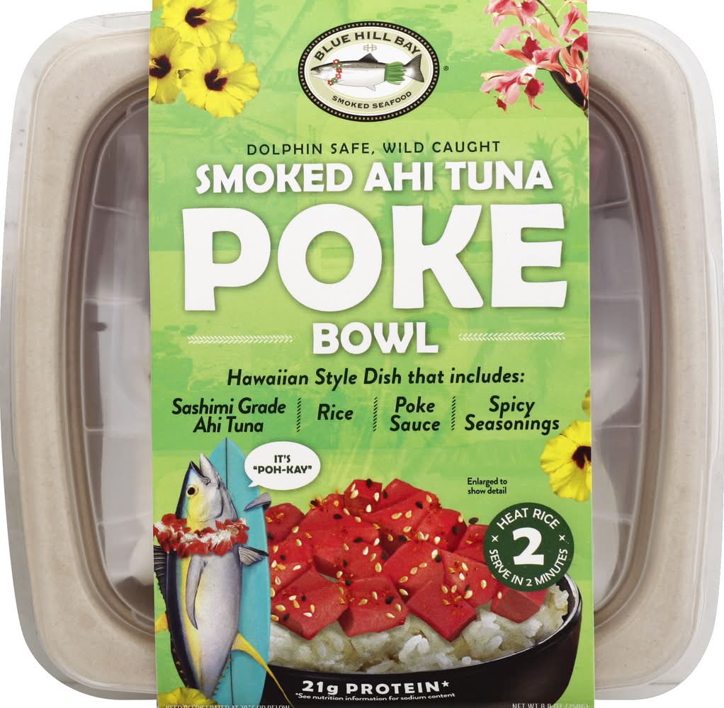 Keep refrigerated at 38 degrees f or below. instructions: 1. remove ingredients from bowl. 2. tear top of rice pouch 1 inch to vent and microwave on high for 45-60 seconds or until warm (based on 1200 watt microwave. microwave oven power may vary; adjust cook time to individual microwave oven to warm rice). 3. dispense rice into bowl (caution - contents may be hot). fluff rice with fork. 4. separate smoked tuna cubes and add to rice along with poke sauce. top with dry seasonings. enjoy! enhance your poke bowl: mix in sliced avocado, cucumber, fresh scallions, watermelon radish, or other toppings you may prefer.