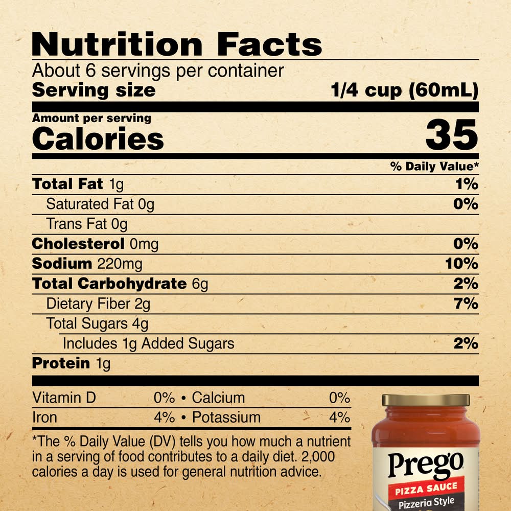 Bring everyone to the table with Prego Pizzeria Style Pizza Sauce, a pizza sauce crafted with tasty ingredients that's made to share with the ones you love. It's the red sauce that brings delicious flavor to every meal, making ordinary meals extraordinary. Highlighting the delicious taste of vine-ripened tomatoes and perfectly balanced with just the right amount of herbs and seasonings, every jar offers a thick and smooth texture for delicious flavor in every bite. Plus, it's vegan and, gluten-free, making it a choice you can feel good about every time you serve it. Prego is the secret to creating easy and delicious meals your whole family will love. Whether it's a quick weeknight dish or a new recipe for family dinner, Prego is the sauce brand you can always count on. With tasty ingredients and a taste that delights, Prego brings everyone together. Family dinners should be stress-free and easy, which is why Prego is crafted to be the foundation of your weeknight meals. With Prego, the taste kids and parents enjoy is right here, ready to enhance your meals and keep everyone at the table a little longer. • Number of servings: 6 • Campbell Soup Company, Camden, NJ • Packaging: Reusable